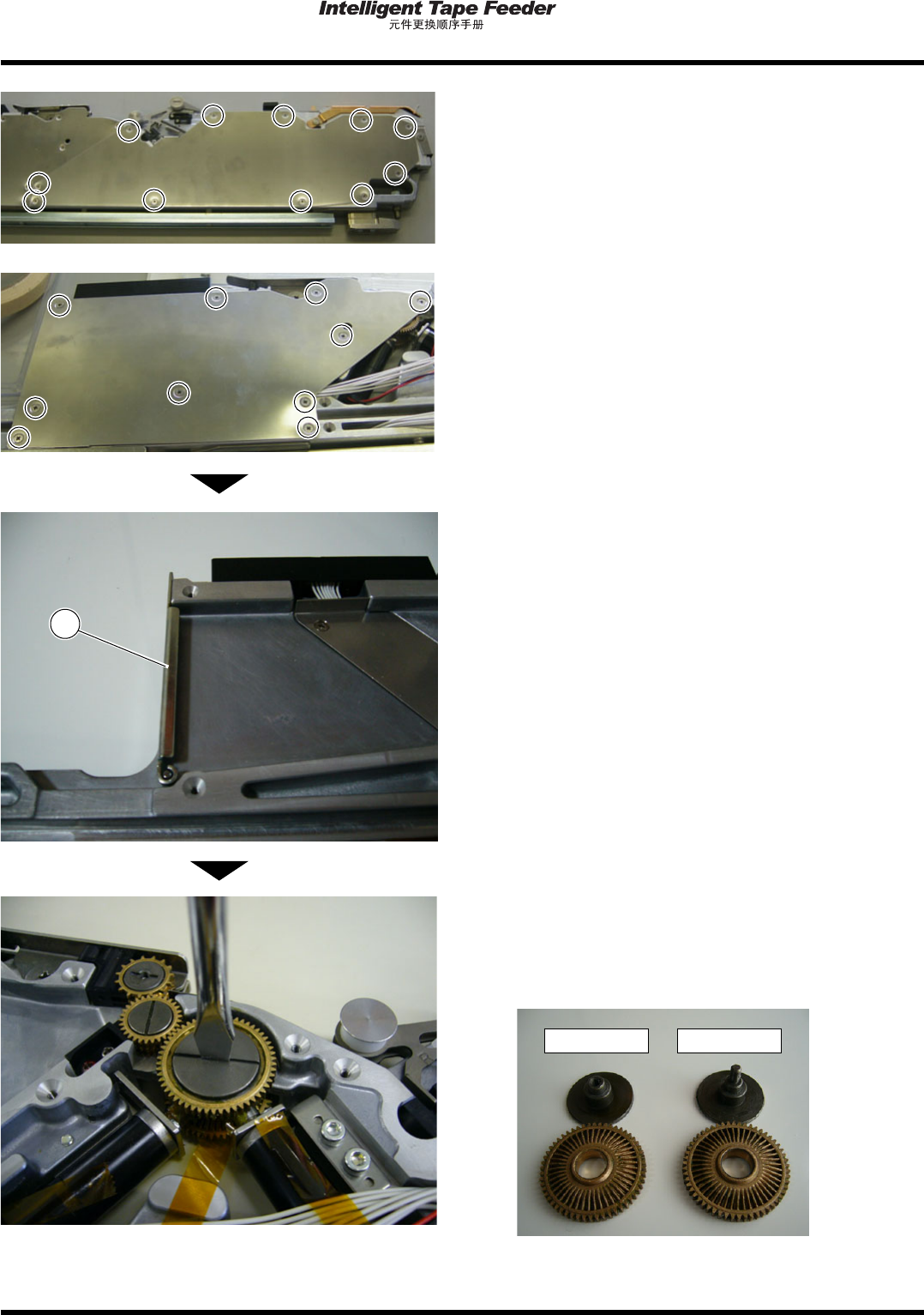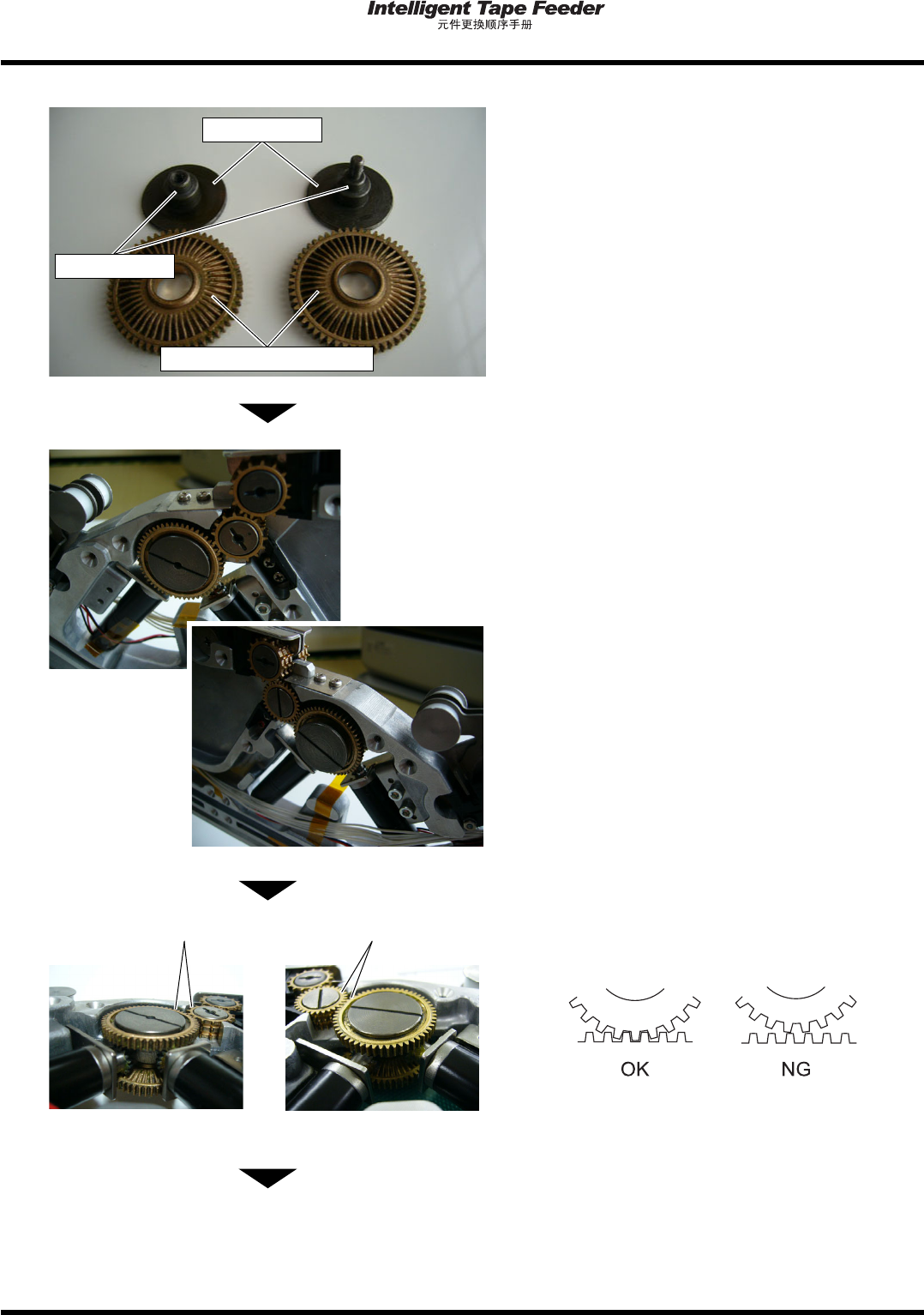 1.10 顶层带导入伞齿轮 INTF-C-PEA01-A04-02 Page 1-39 安装 1. 更换为新的齿轮后,在平移面、轴侧面、 伞齿轮的齿面上薄薄地涂敷润滑脂。 请勿涂敷在伞齿轮的外周齿面。 请使用如下润滑脂。 MP 润滑脂 2S ( 型号 : N510006423AA) 2. 使齿轮吻合后用螺钉暂时固定。 3. 确认电机侧齿轮和伞齿轮的吻合状态。 请确认高度与相邻小齿轮是否一致。 下一页 L 侧 R 侧 平移…