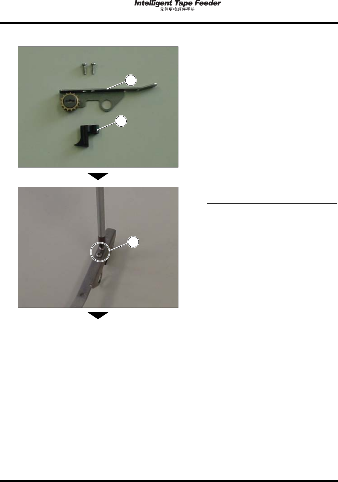 1.6 上侧齿轮盘 INTF-C-PEA01-A02-02 Page 1-19 安装 1. 在导杆 上安装齿轮盘 。 2. 用十字螺丝刀安装 L 侧固定螺钉 。 拧紧扭矩 60 cN·m ( 10 cN·m) 组装时, 请使齿轮盘的凸钩插入到齿 轮槽之间。 下一页 INTF-236P 2 1 INTF-235P 3
