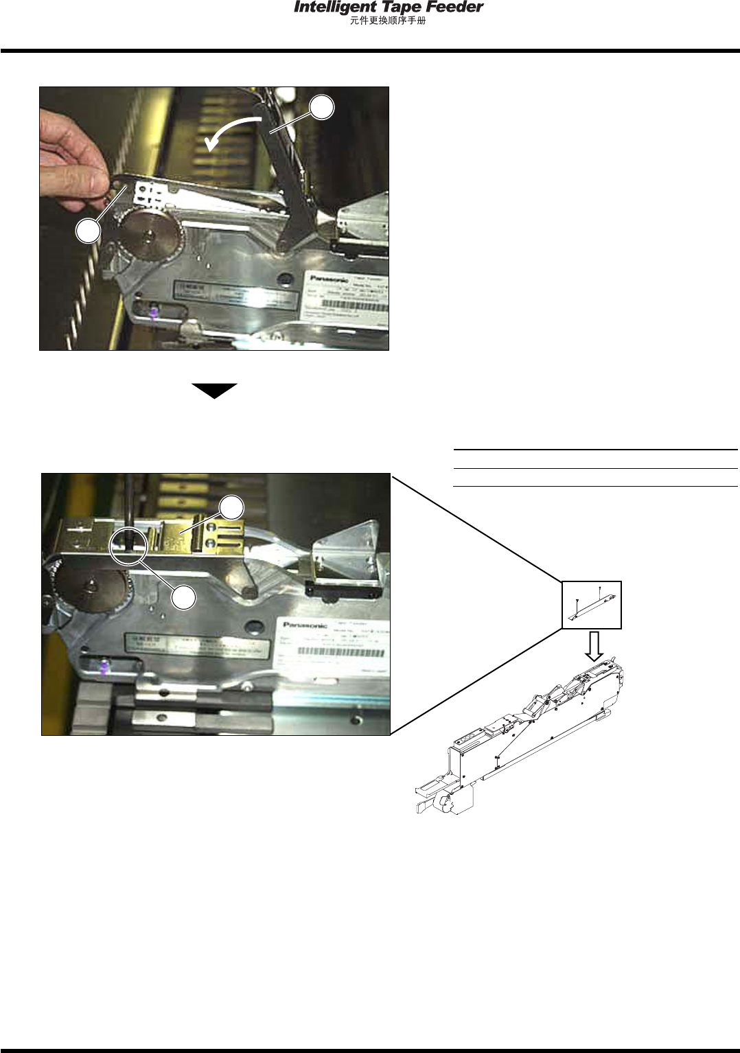 2.4 编带导轨 Page 2-10 INTF-C-PEA02-A01-03 2.4 编带导轨 2.4.1 吸着下部 使用工具 十字螺丝刀 ( 位号码 1) 拆卸 1. 拆卸编带导轨的固定螺钉 (2 处 ) 。 通常在压紧编带盖 关闭的状态下进行作业, 但根据供料器的宽度,也有在打开的 状态下作 业的情况。 2. 打开压紧编带盖 后,拆卸编带导轨 。 INTF-086E INTF-214P 1 2 INTF-21…
