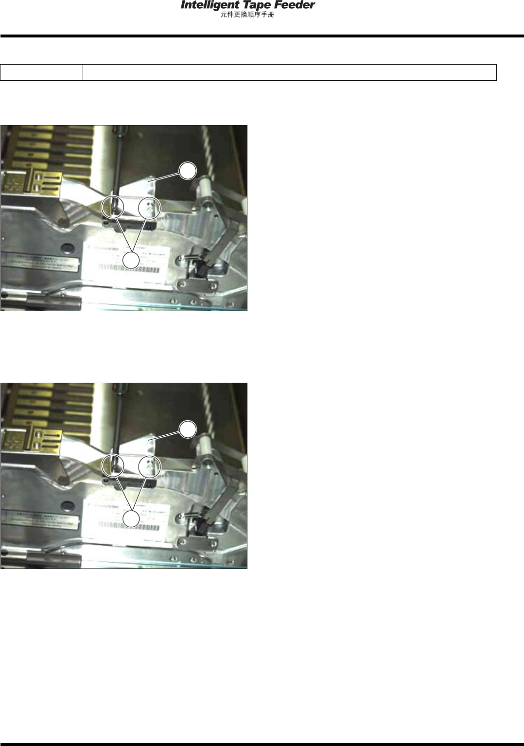 2.4 编带导轨 Page 2-12 INTF-C-PEA02-A01-03 2.4.2 载体编带搬送导轨 使用工具 十字螺丝刀 ( 位号码 1) 拆卸 1. 拆卸编带导轨的固定螺钉 (2 处 ) 后, 拆 卸编带导轨 。 安装 1. 安装好编带导轨 之后,用固定螺钉 (2 处 ) 紧固。 INTF-216P 2 1 INTF-216P 2 1