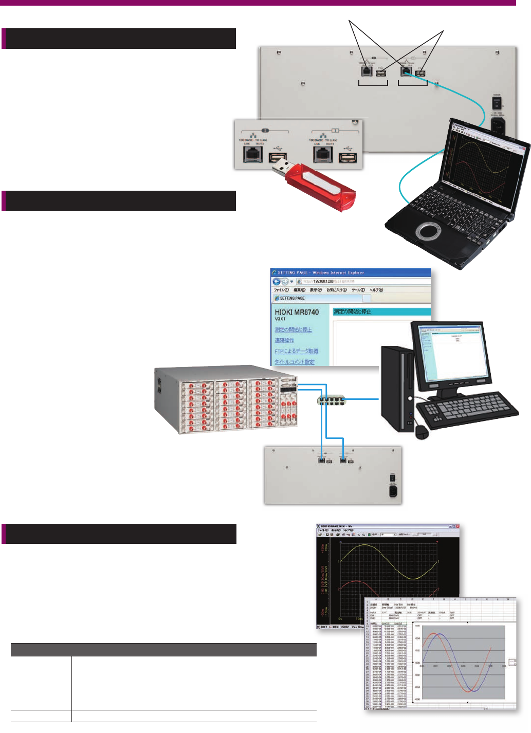 8 USB 端口 A (U 盘用 ) LAN 端口 模块Ⅱ 模块Ⅰ hub PC分析 标配应用 软 件 CD ( 波形查看软 件Wv ) ●利用PC对存储记录仪捕捉到的二进制数据进行波形确认 ●需要读入EXCEL时,可用此软件进行CSV转换 此软件为免费的附带软件。最新版本可从HIOKI主页下载。 测量数 据可 保存在 U盘 。 轻松记 录测 量 数 据, 使用 U盘 可 将数据轻 松 复 制到 电 脑上 。 标配1 0 0B A SE…