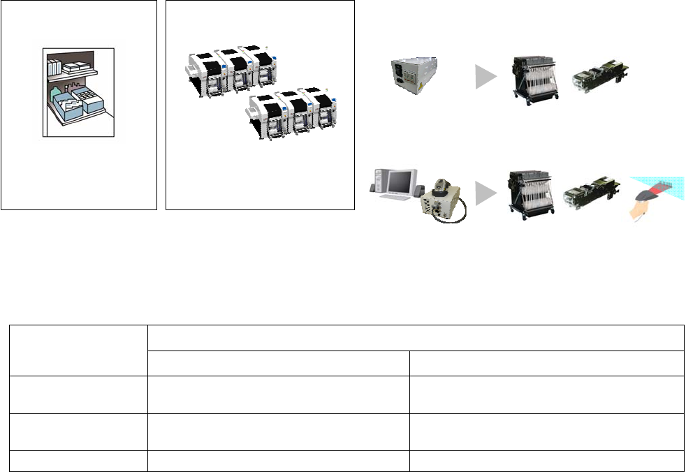 使用客户持有的预备交换台车和供料器,在生产中可以进行下一机种的准备,大幅度减少机种切换的损失时间。