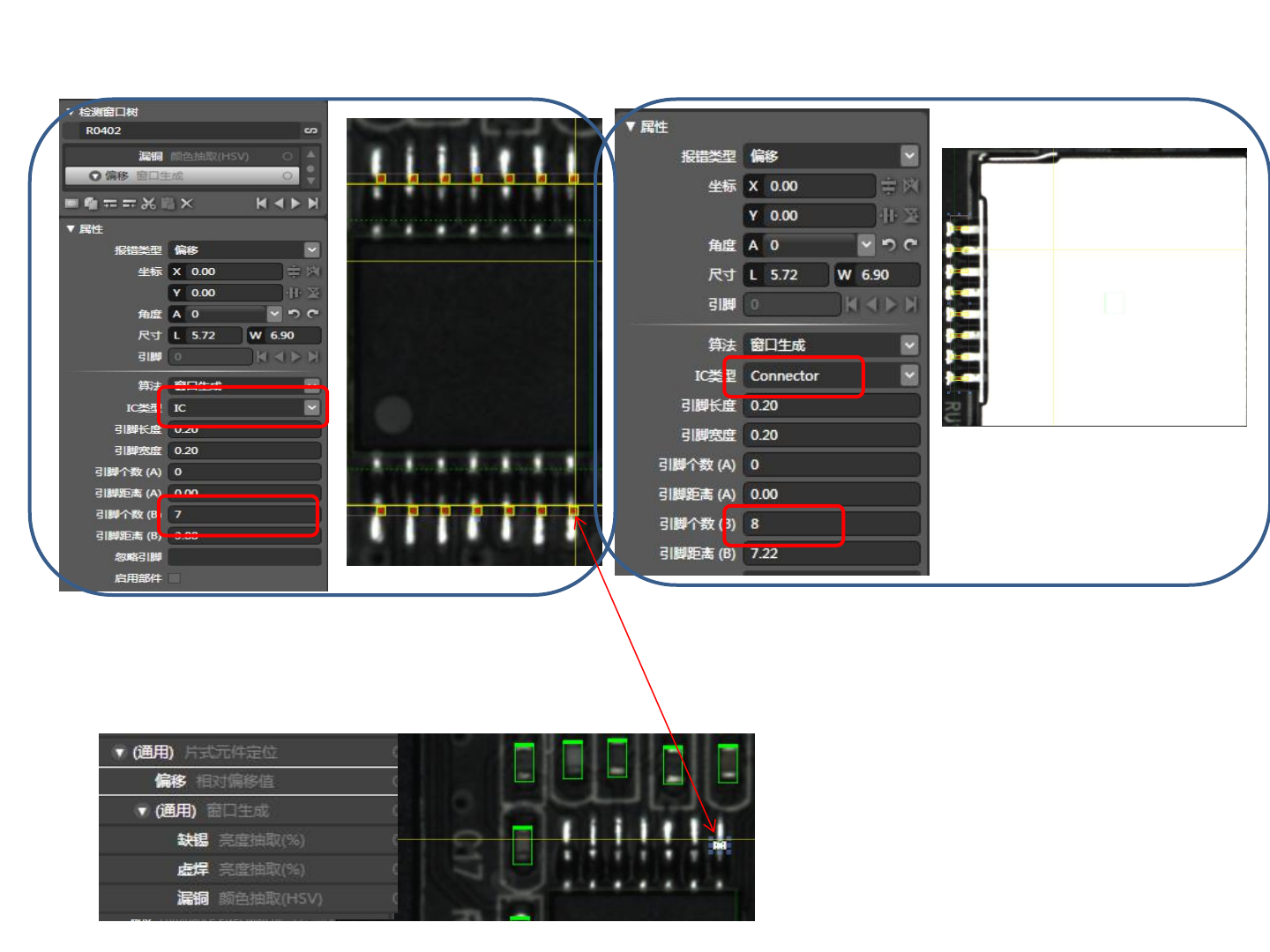 算法:窗口生 成 定 义 : 在 检测 窗口指定的区 域内,以 实 时 响 应 方式快 速矩 阵 / 阵 列形 式生成一系 列 检测 窗口 。 输 入引脚个 数( AorB 方向) , 拖 动 黄色窗口, 将 红 点移到 需要 检测 的位 置,新建降 级 ,我 们 即可在 检测 位置制 作 对 应检测 程式 如缺 锡 ,虚 焊 , 漏 铜 等 如下 图 选择类 型“ IC ” , 即会生成 7 对对 称窗口( 14 个窗口) 选择类 型…