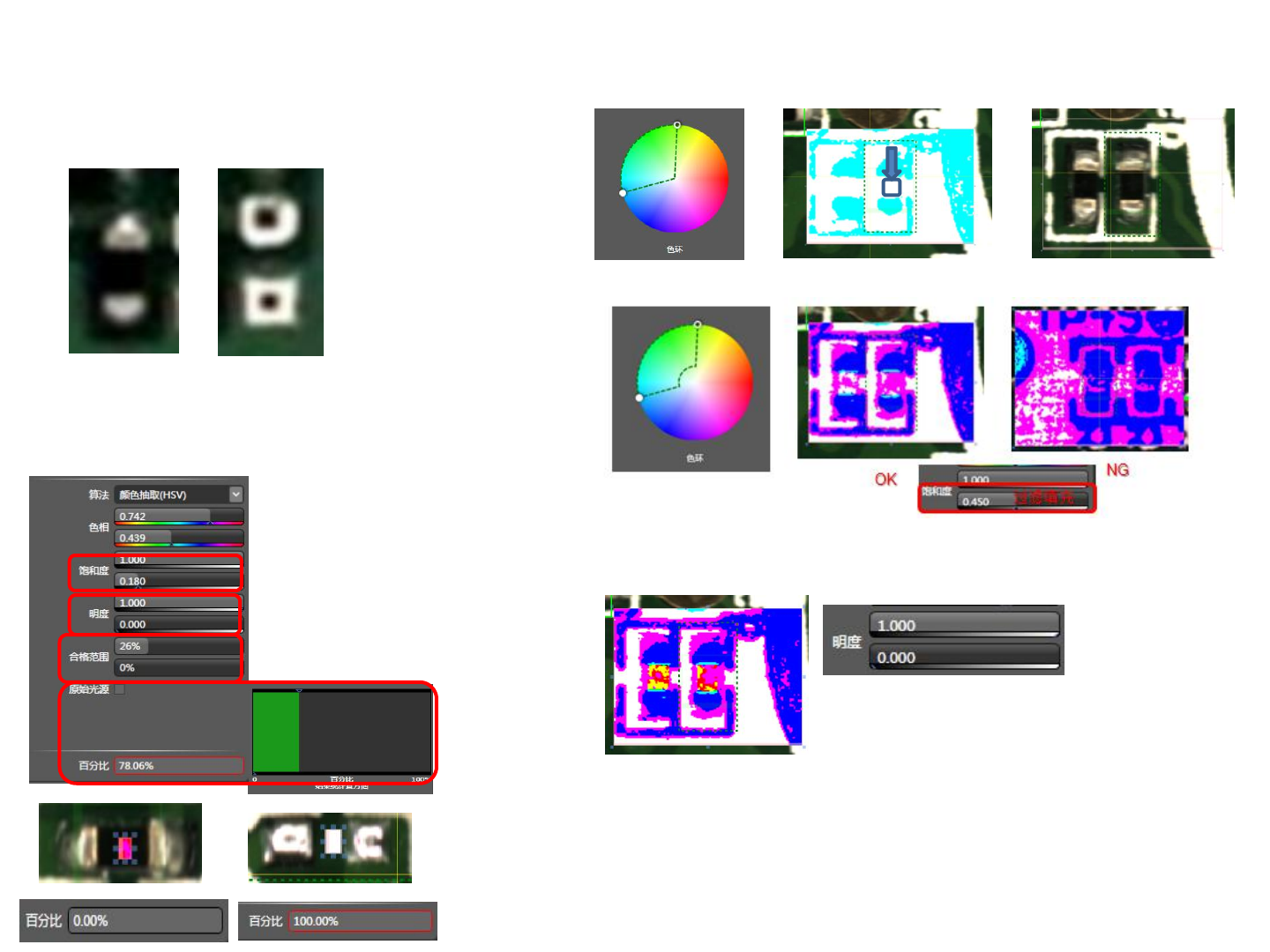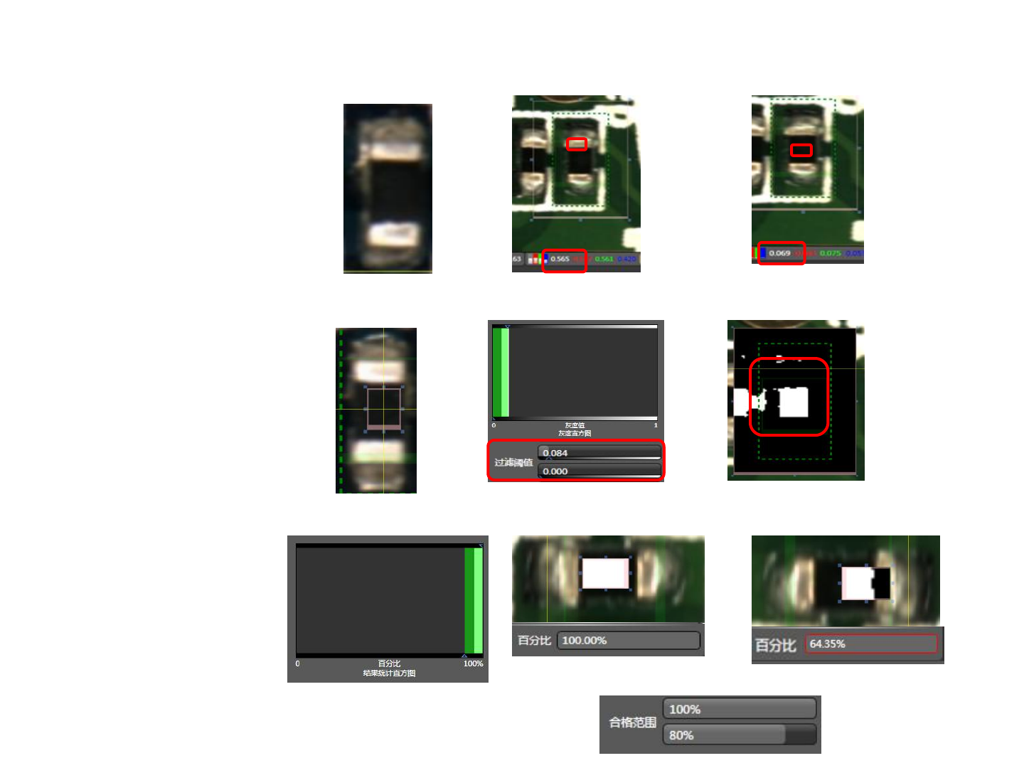 认为绿色占的比例越少证明该位置有元件存在,故将合格范围设置往左拉,占有比