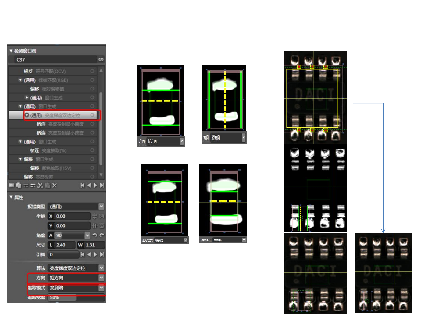 在检测窗口指定的区域内,以及指定的范围内,在指定的方向(长或短方向),自动追踪获取指定方