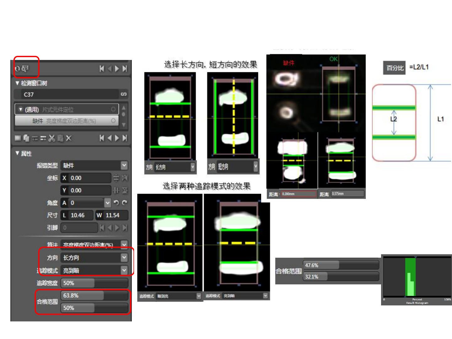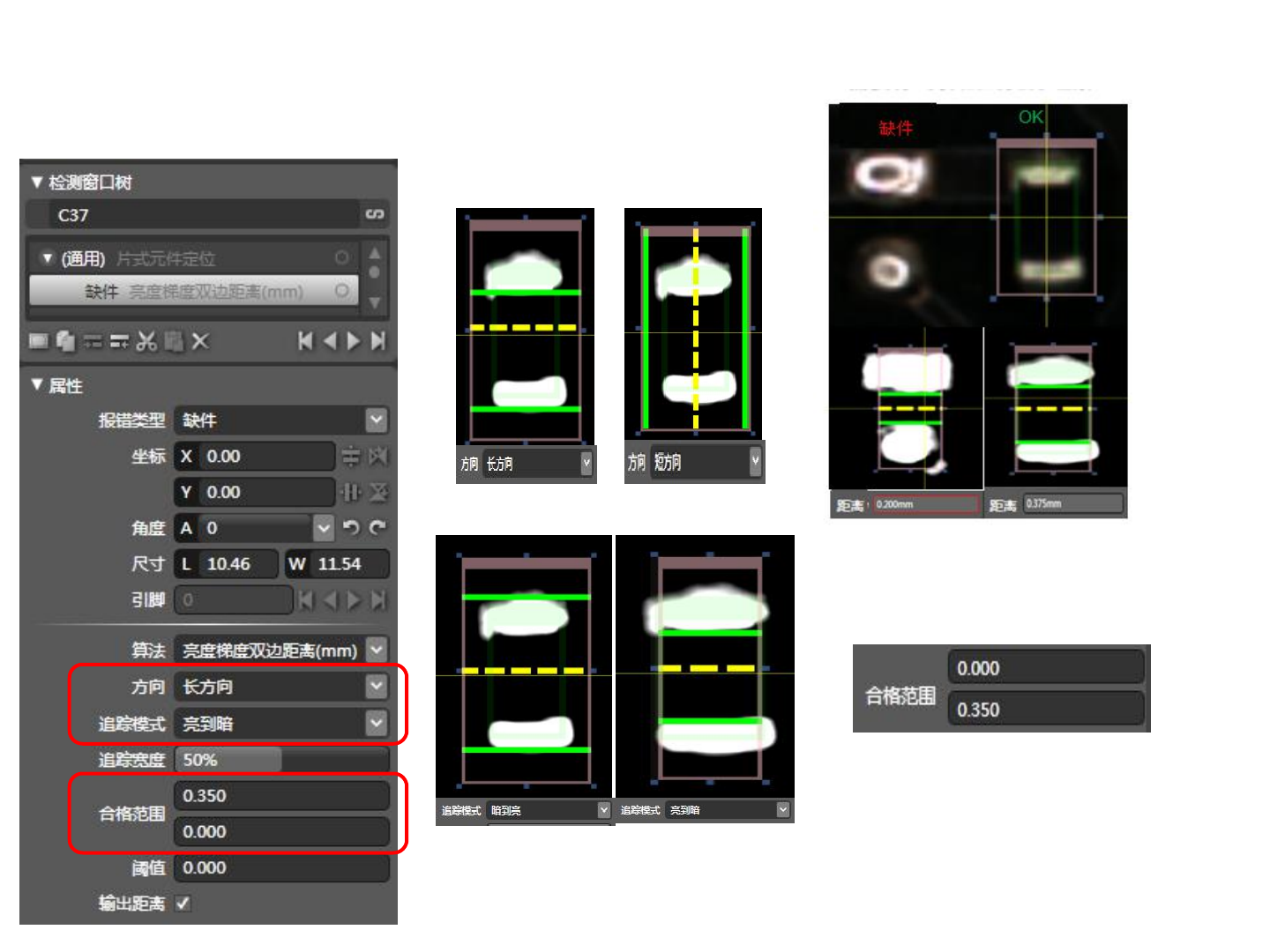 电 阻缺件的差异你找了 吗 ? 需要你 对 算法的充分理解 找到一种光源如上 图 所示,当出 现 距离 的差异 时 ,使用算法亮度梯度双 边 距离( mm ), 设 置范 围 ,当元件缺件的 时 候,距离会 变 短, 设 置下限如下 图 如果缺件,两 条 绿线 的距 离是 0.200 less than 0.35 , 报 警:缺 件 算法:亮度梯度双 边 距离( mm ) 在“亮度梯度双 边 定位” 获 取的两条 边 界的基 础 上, …