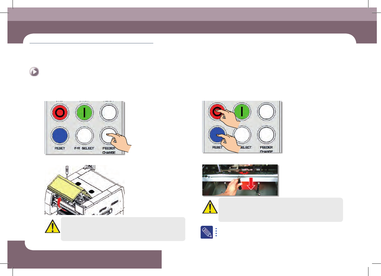 DE CAN S 2 Op e rat io n Ha nd b oo k 3-1 6 Chap ter 3 本 Chapter 主要介绍生产作业顺序 生产 Advanced Chip Shooter 准备生产 Ⅱ > 布 置Ba ck up Pin 准备生产 Ⅱ 生产 3. 布置 Ba ckup Pin Step 1. ' FEED ER CHA N G E' 按钮 Step 2. 打开 前/后 安 全 门 …