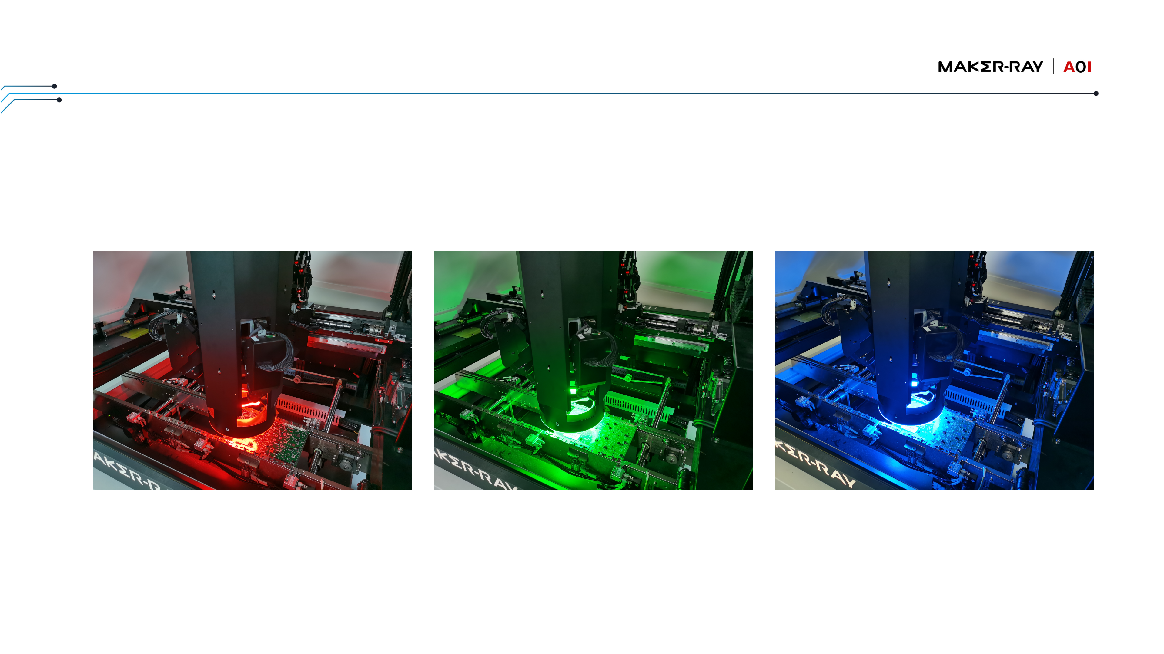 通过RGB对锡膏、⽩线、杂物进⾏过滤,有效避免锡膏桥接的伪判情况 RGB有源三⾊、2D照明光源 AIS63XSeries - SPI|技术优势