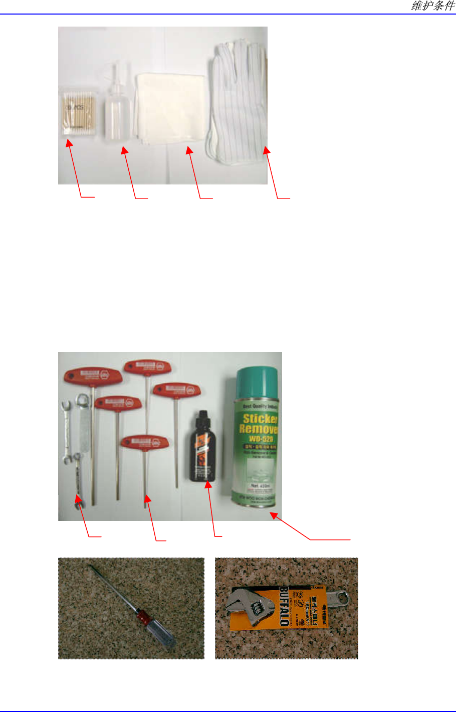 1-5 棉棒 干净的布 酒精 凹凸 ( e mb o s s) 手 套 棉棒 / 酒精 擦拭 Fly Camera 镜片的表面。 干净的布 Mirror 或镜片上有异物而需要清扫 时使用。 凹凸 (emboss) 手套 清扫 Camera 或 Mirror 时使用。 1.3.2. 其它供应工具 起子 活动扳手 吸嘴用润滑油 ( 吸嘴弹簧用 ) 扳手 (7mm) T 扳手 吸 嘴 异 物 清 除 用 喷 射 器