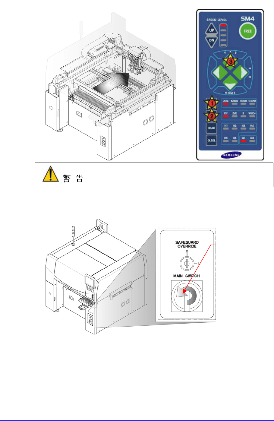 3-7 Mirror 刷子或小刷子 Flying Camera Lens 操作示教盒,最大限度向后 移动贴装头组件。 单击 Teaching Box 的 ” Motor Free ” 键后,单击正面操作面板 的 ” Stop ” 与 ” Reset ” 键。检验时,必须关闭电动机的电源 。 作业空间不足时请手动向前 移动贴装头组件。 关闭设备前面的主开关。