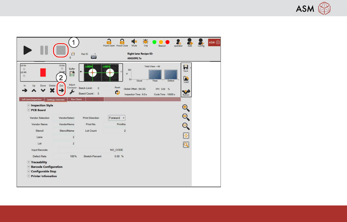 Operation - Production Error Handling 36 www.asm-smt.com How To Transport PCB To Output 1. Click Cycle Stop 2. Click Transport PCB Out