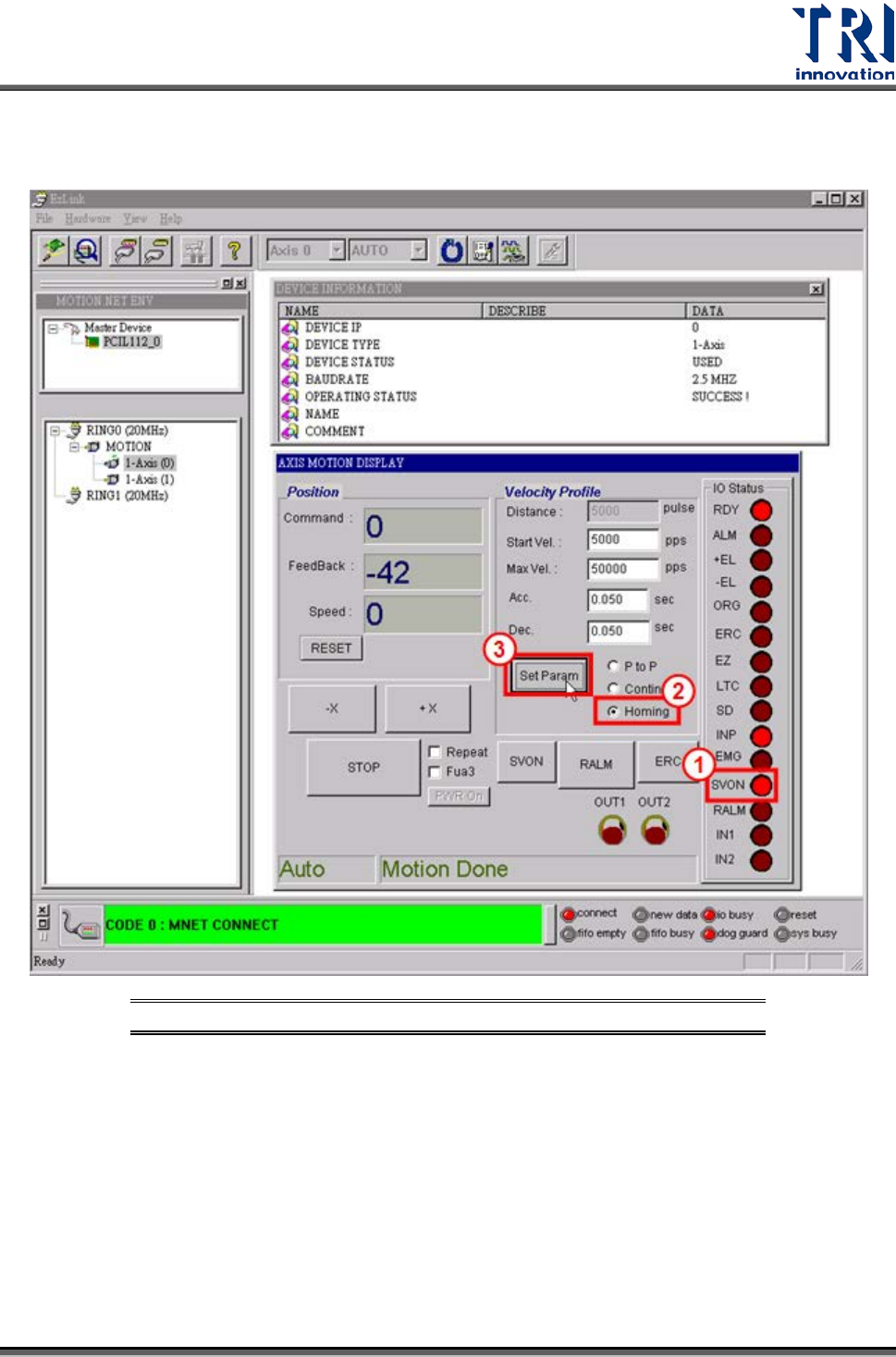 B. 確定[SVON]燈亮起後,選擇[Homing],接著按下[Set Param]寫入設定的參