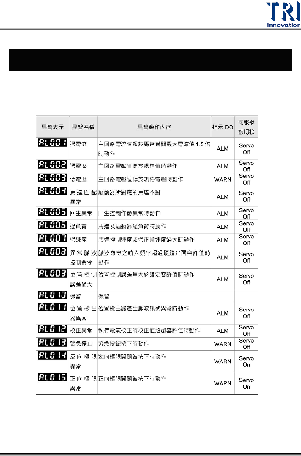 驅動器異警一覽表