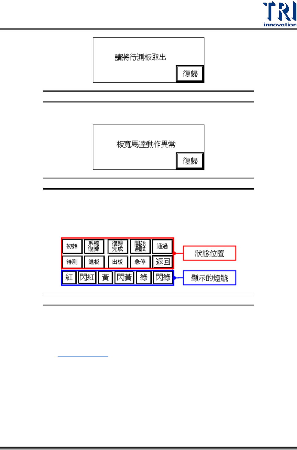 Test Research Inc. TR 7700 SII User Guide -- Hardware 9 圖 15 :其他設定 – 板寬設定 – 請將待測板取 出畫面 圖 16 :其他設定 – 板寬設定 – 板寬馬達動作 異常 畫面 燈號:三色燈燈號的顯示設定。先按下要設定的狀態位置,使其反黑,再按下該步 驟所要顯示的燈號。若不設定將顯示出廠的預設值。 圖 17 :其他設定 – 燈號 畫面 延伸 SMEMA :套用延伸的 …