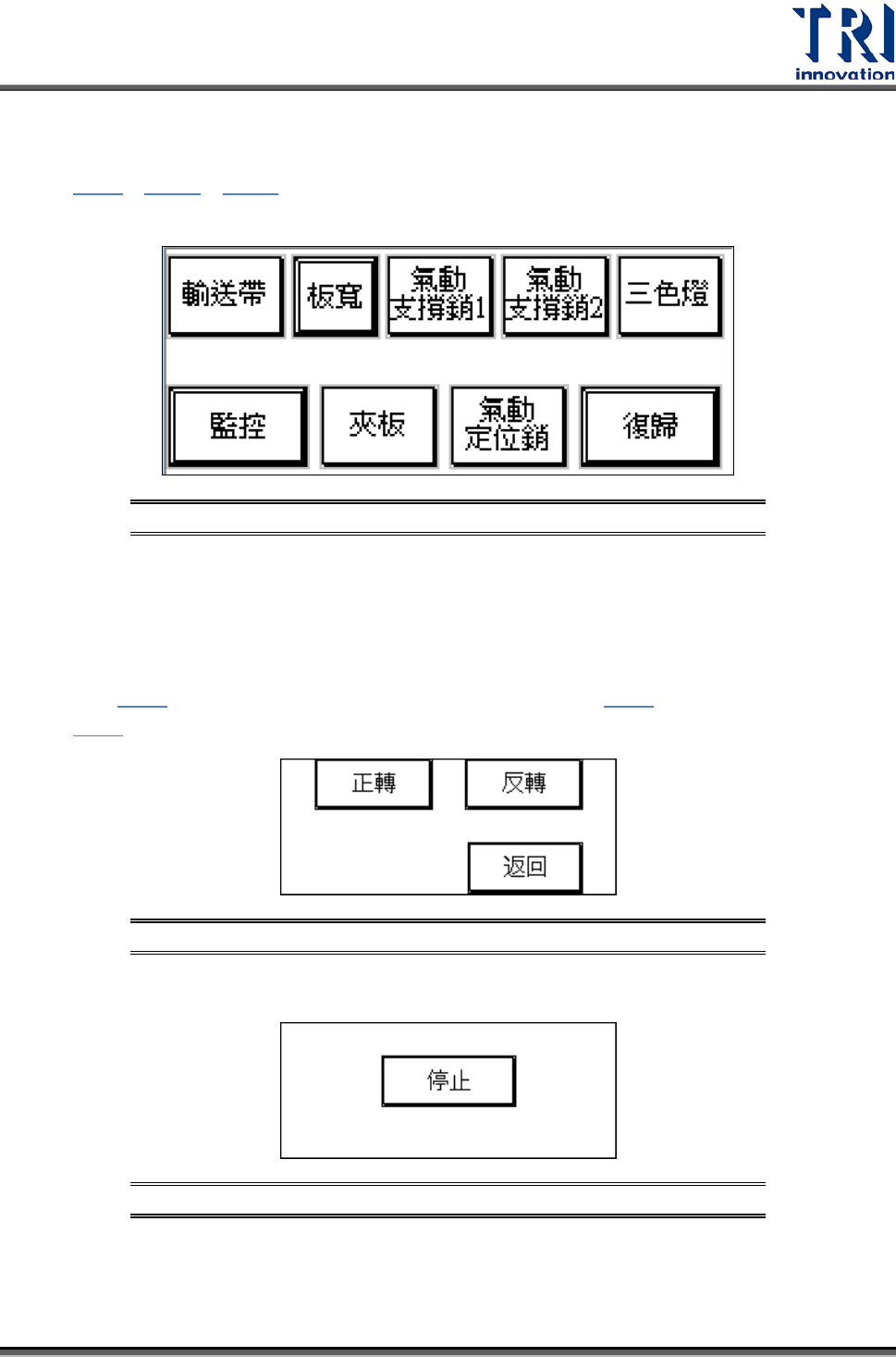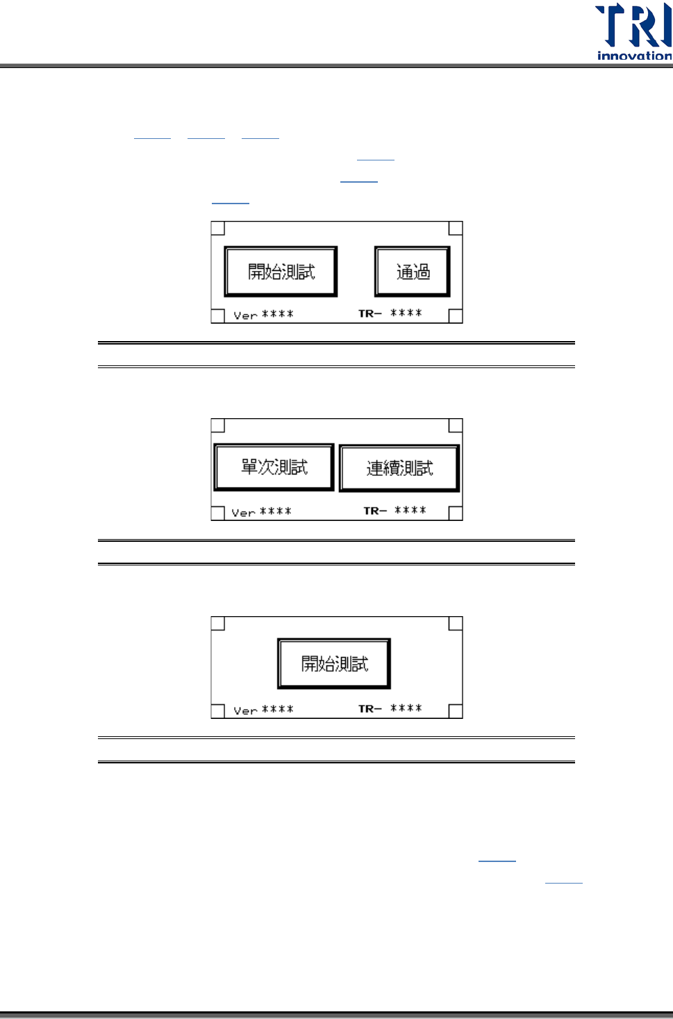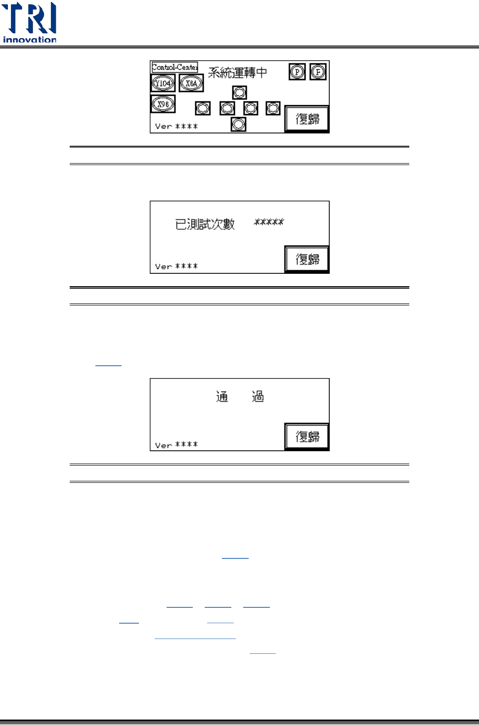 Test Research Inc. 20 TR 7700 User Guide -- Ha rdw are 圖 46 :系統運轉 中畫面 圖 47 :顯示已測 試次數畫面 連線模式:在連線模式時,若系統故障或不想檢測,則需按下 [ 通過 ] ,畫面會顯 示通過如 ( 圖 48 ) ,使 PCB 不經檢測,直接流向後站。 圖 48 :通過畫面 單機模式:在單機模式,可選擇 [ 連續測試 ] ,當測試完成後取出板子超過 0.5 秒…