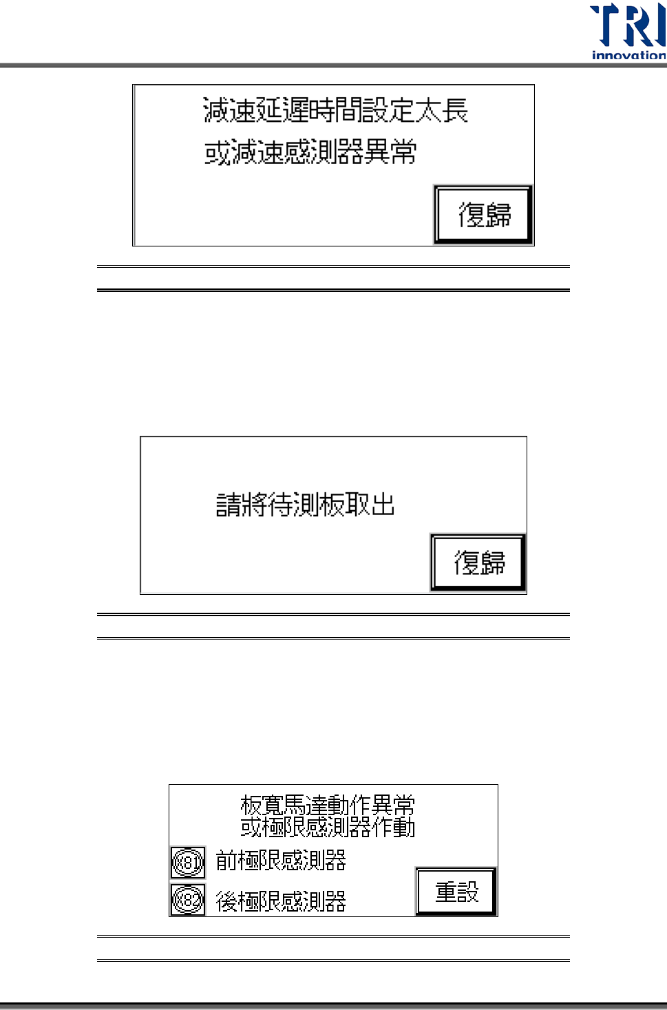 Test Research Inc. 30 TR 7700 User Guide -- Ha rdw are 3.3.4 夾板未到定位或支撐馬達異常,手動重新設定 可能造成原因如下: 1) 感測器 5 或 6 開關不正常,檢知高度調整不正確,或感測器 5 或 6 故障。 2) 馬達未動作,馬達或馬達驅動器故障。 圖 72 :人機介面 – 夾板未到定位或 支撐馬達異 常,手動重 新設定 3.3.5 PC & PLC 連線中斷 待測…