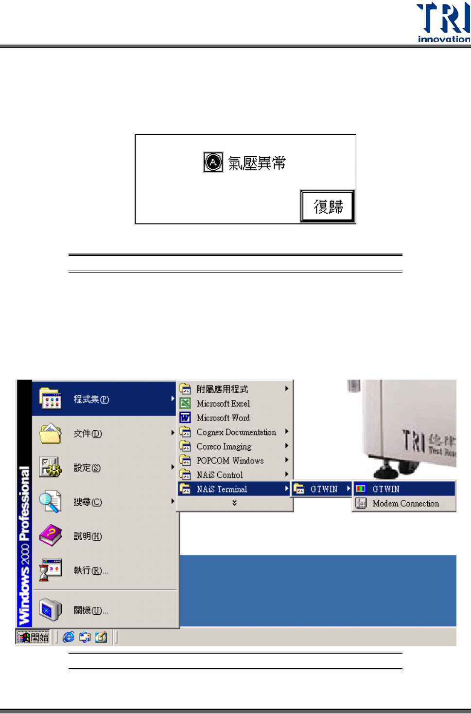當機台後下方的氣壓計感測到氣壓異常時,會傳送訊息給 PLC,並顯示以下畫面。