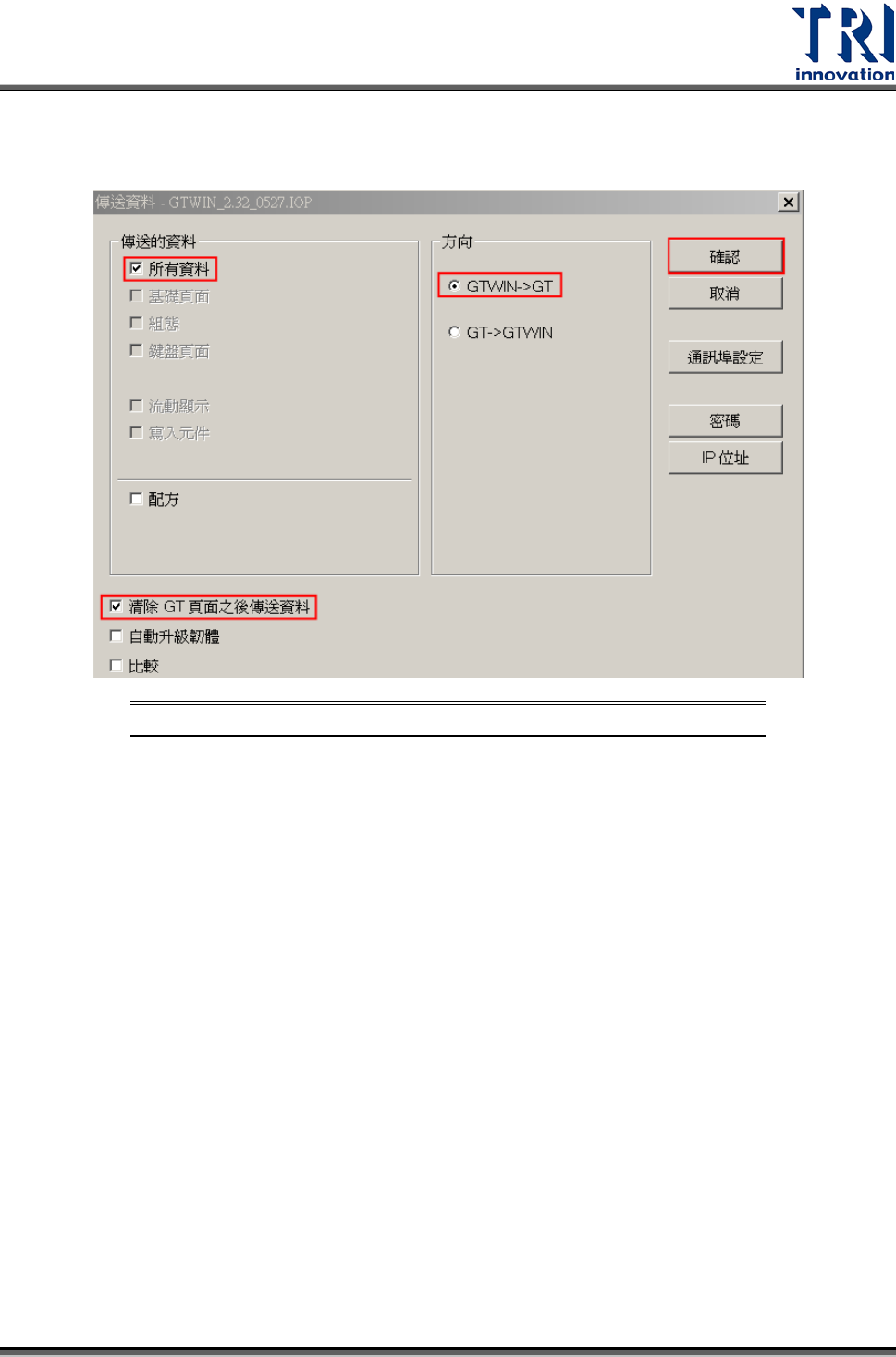 [GTWIN->GT]及[清除 GT 頁面之後傳送資料]後,點選[OK],如下圖所示。