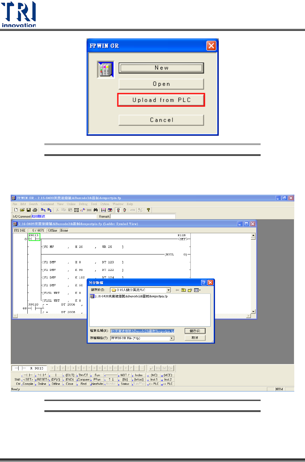 Test Research Inc. 36 TR 7700 User Guide -- Ha rdw are 圖 85 :人機介面 – PLC 程式更換 – 選擇 Upload f rom PLC 畫面 4) 讀取後,點擊 [File] 選擇 [Save as] ,把原先舊檔案先備份儲存。 圖 86 :人機介面 – PLC 程式更換 – 備份舊檔畫面