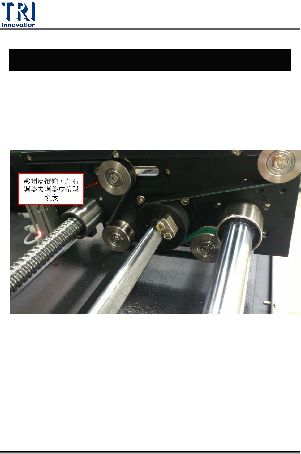 Test Research Inc. 42 TR 7700 User Guide -- Ha rdw are 4 輸送帶 4.1 架構及功能 輸送帶主要功能在於帶動 PCB 完成進出板的動作。在機台長期運行之下,可能因人為 因素造成輸送帶未完全落於從動軸上,建議使用者在使用機台時,能注意前後輸送帶 是否落於從動軸上,可增加輸送帶的使用壽命;若需更換皮帶,需鬆開如下圖所標示 的皮帶輪,然後將皮帶取下。更換上新的皮帶並套上皮帶輪後,再調整皮…
