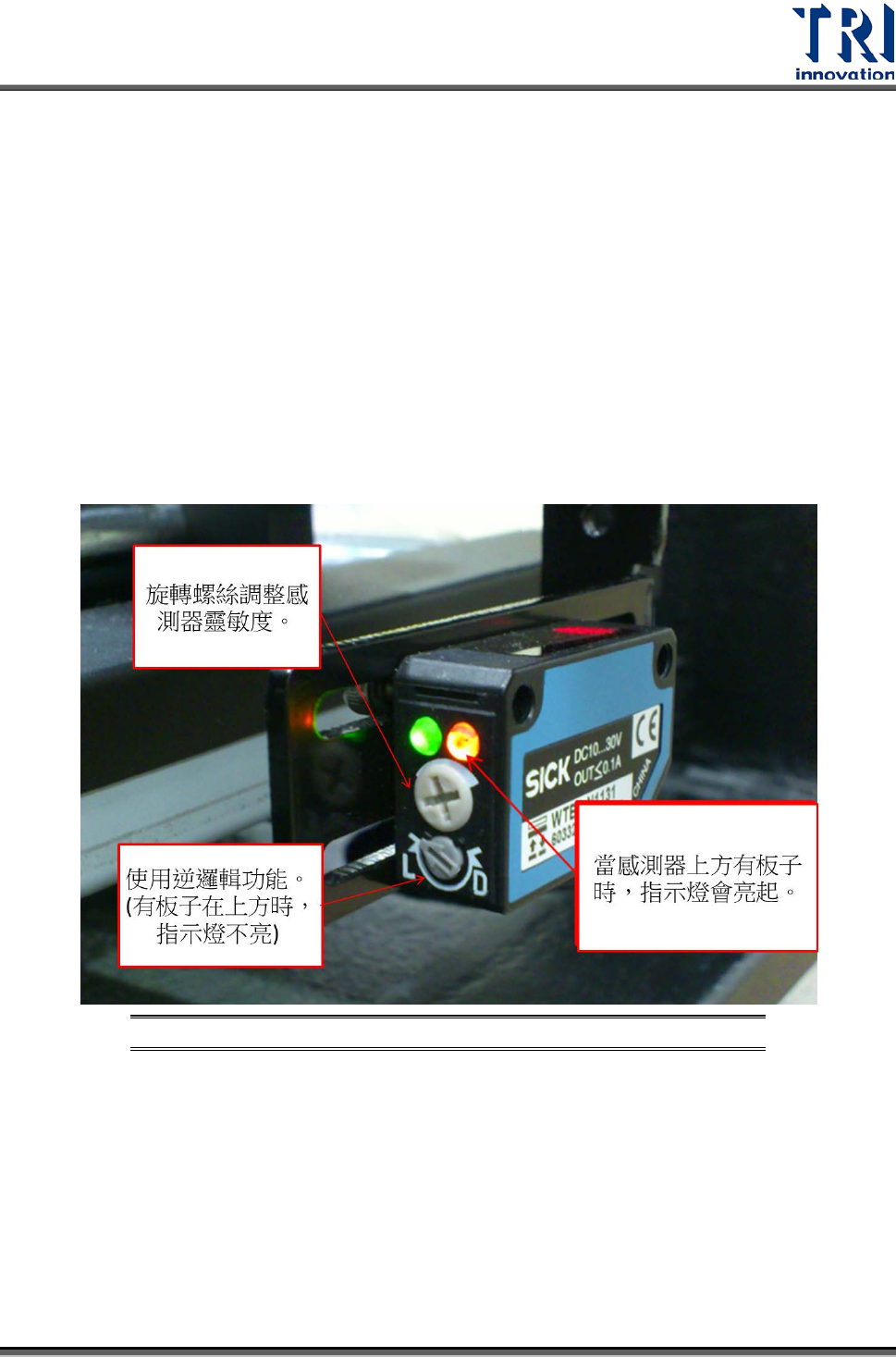 1) 感測器 1 及感測器 4 (進出板用感測器):用調棒調整感測器強度至指示燈亮(感測