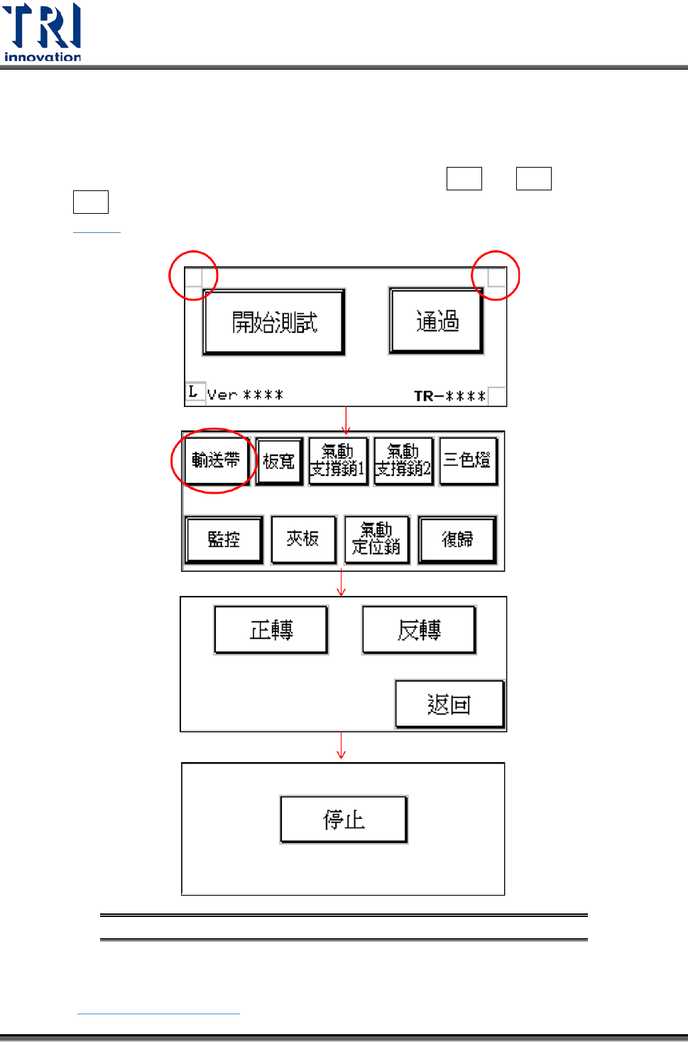 Test Research Inc. 76 TR 7700 User Guide -- Ha rdw are 8.3 輸送帶 若感測器或輸送帶發生問題,建議先用手動測試。如下圖所示,在開始測試畫面下按 下左上與右上的隱藏鍵後,按下 [ 輸送帶 ] 。此時可以選擇 正轉 或者 反轉 進行測試,並 可按下 停止 終止正轉或者反轉的輸送帶運作。如果運作上發生問題,可以觀察其狀態 並參考 圖 128 ,進行故障排除。 圖 131 :輸送帶手 動…