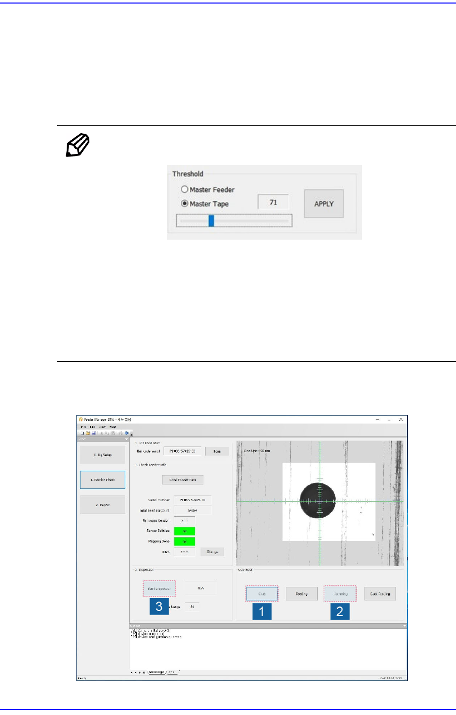 3-16 User's Guide For Tape Fe eder Calibration Jig 1) Check whether the ho le position is correctly recognized repeatedly by clicking the <Grab> button 3~5 tim es. When the origin of the master feeder hole cha…