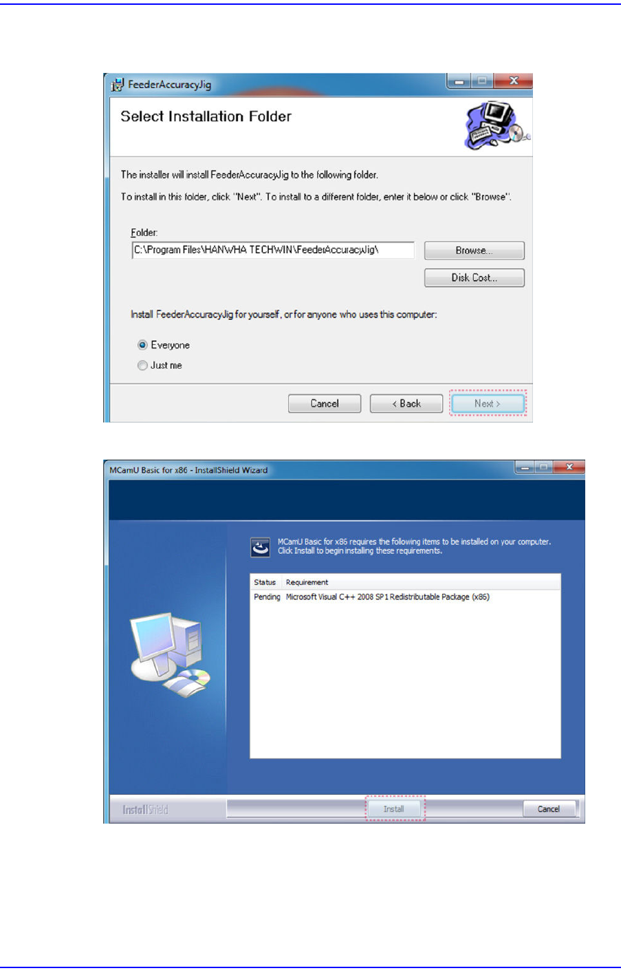 4-2 User's Guide For Tape Fe eder Calibration Jig 2. Clic k the <Next> button continuously until the < Install> but ton appears as shown in the following figure: 3. Clic k the <Install > button.