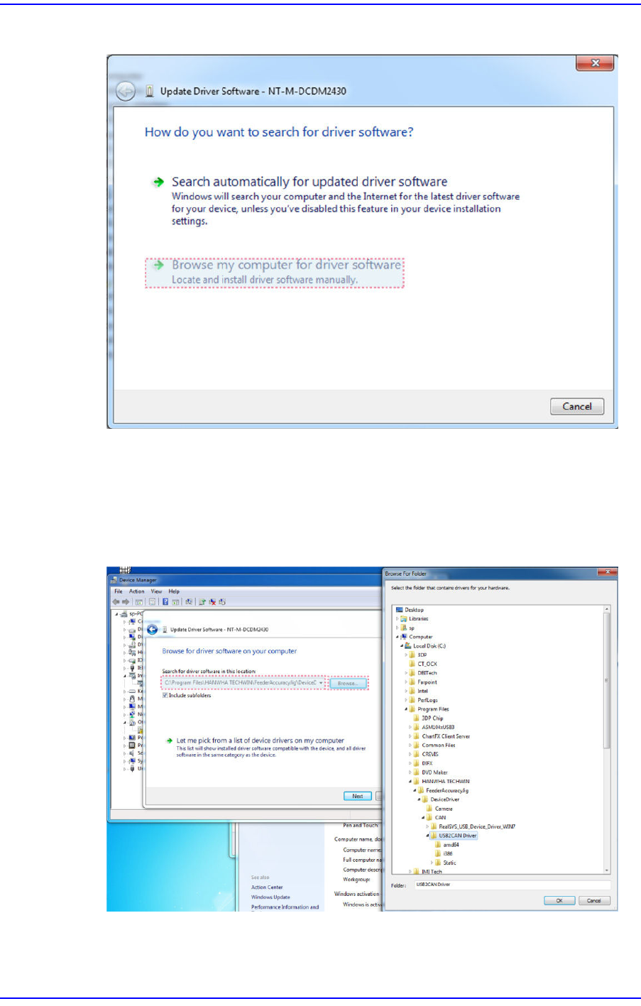 4-8 User's Guide For Tape Fe eder Calibration Jig 15. Select the ’Brows e my computer for driver software’. 16. Click the <Browse…> b utton and set the path for the program installati on referring to the follo…