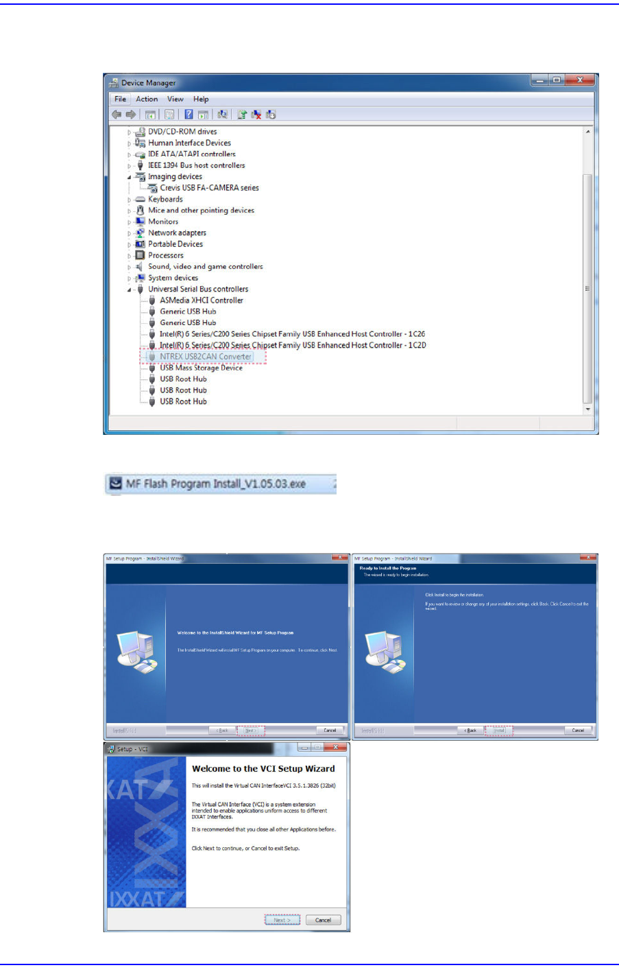 4-10 User's Guide For Tape Fe eder Calibration Jig 19. Check whether the [NTREX USB2CAN Conv erter] is recognized properly to the ’Universal Serial B us controllers’ in the Device Manager . 20. Run the Feeder Firmwa…