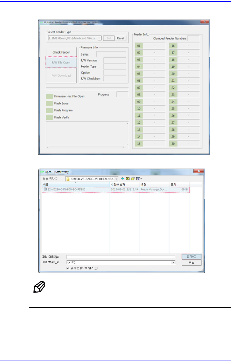 4-15 Program Installation 4. Click the <F/ W File Open> button. 5. Select the fi rmware Hex file. Memo The "V0210" section in the Hex fil e name in the No. 5 step means that the firmware version is "…