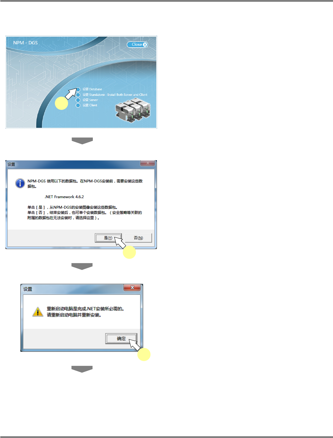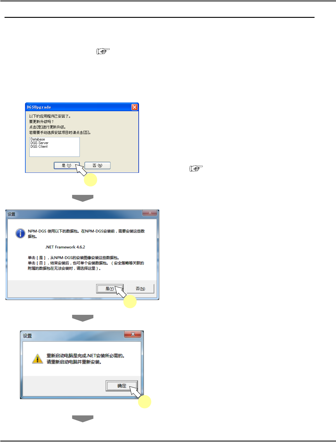 NPM-DGS 程序手册 2.2 DGS 应用程序的升级 EJS9AC-MB-02P-19 Page 2-95 4 点击 [ 下一步 ] 。 在之后的操作下, 将显示与 安装 DGS 的构成相 应的设置画面,请按照指示进行操作 。 Install020302S-0 2C02 4