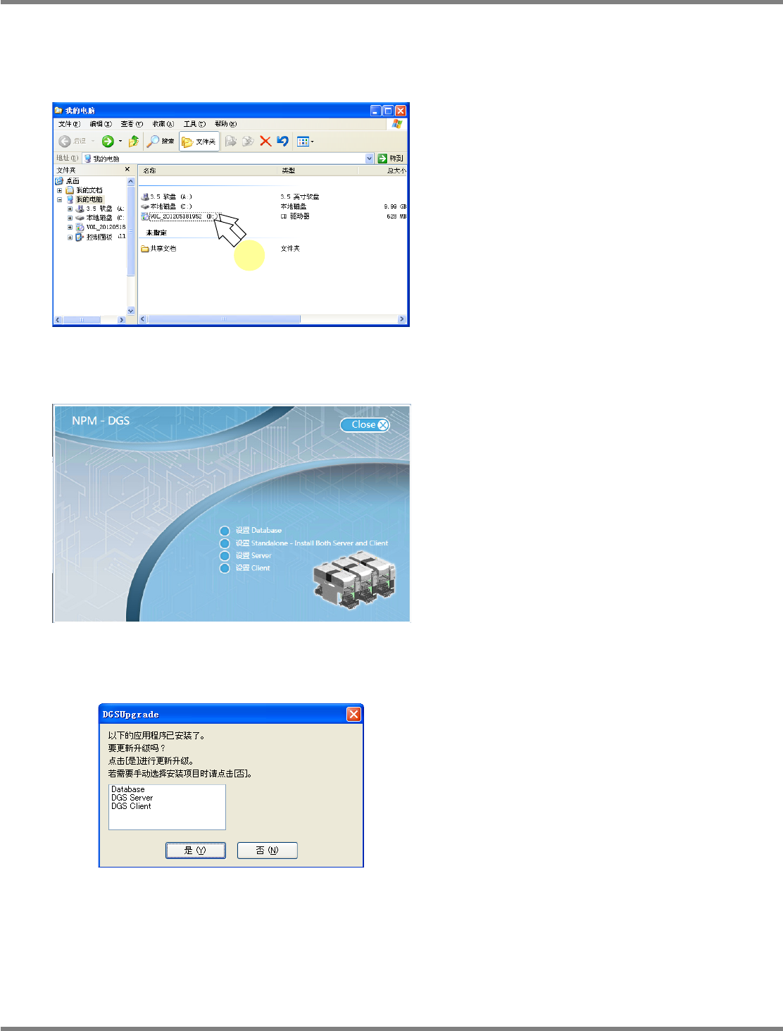 NPM-DGS 程序手册 2.2 DGS 应用程序的升级 EJS9AC-MB-02P-19 Page 2-99 2.2.5 当安装 CD 没有自动启动时 根据 PC 的设定不同,有时会发生安装 CD 插入 CD 驱动器后不自动启动、并不显 示 DGS 安装画 面的情形。在这种情形下,请按照下 述操作启动安装画面。 1 打开我的电脑后,双击 CD 驱动器。 新建安装 DGS 时 将显示安装画面。 即已安装了 DGS 时 将…