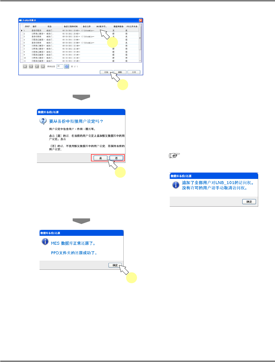 NPM-DGS 程序手册 3.2 关于环境设定画面 Page 3-22 EJS9AC-MB-03P-16 还原 1 点击 [ 还原 ] 。 显示出 < 还原 > 画面。 2 点击 [...] 。 显示出 < 打开 > 画面。 3 指定还原源文件所在的目录。 4 指定还原文件。 5 点击 [ 打开 ] 。 6 单击 [ 还原 ] 。 将显示确认画面。 7 选择是否继续进行用户设置。 将实施数据的…