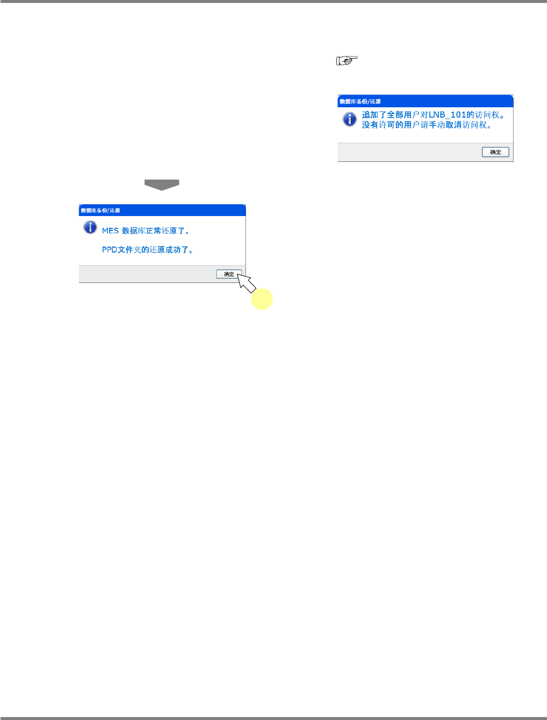 NPM-DGS 程序手册 3.2 关于环境设定画面 EJS9AC-MB-03P-16 Page 3-23 没有继续时,将会显示下述信息,并 针对在备 份所恢复的实际生产线而追加访问权 。生产线 的访问权设定,请参照下述记载。 ( ‘8.1.5 用户帐户的变更 ■可参照实际 生产线的变更 ’) 8 将显示还原完毕的对话框, 点击 [ 确定 ] 。 Environment03 0104S-12C01 8 Environment03 02…