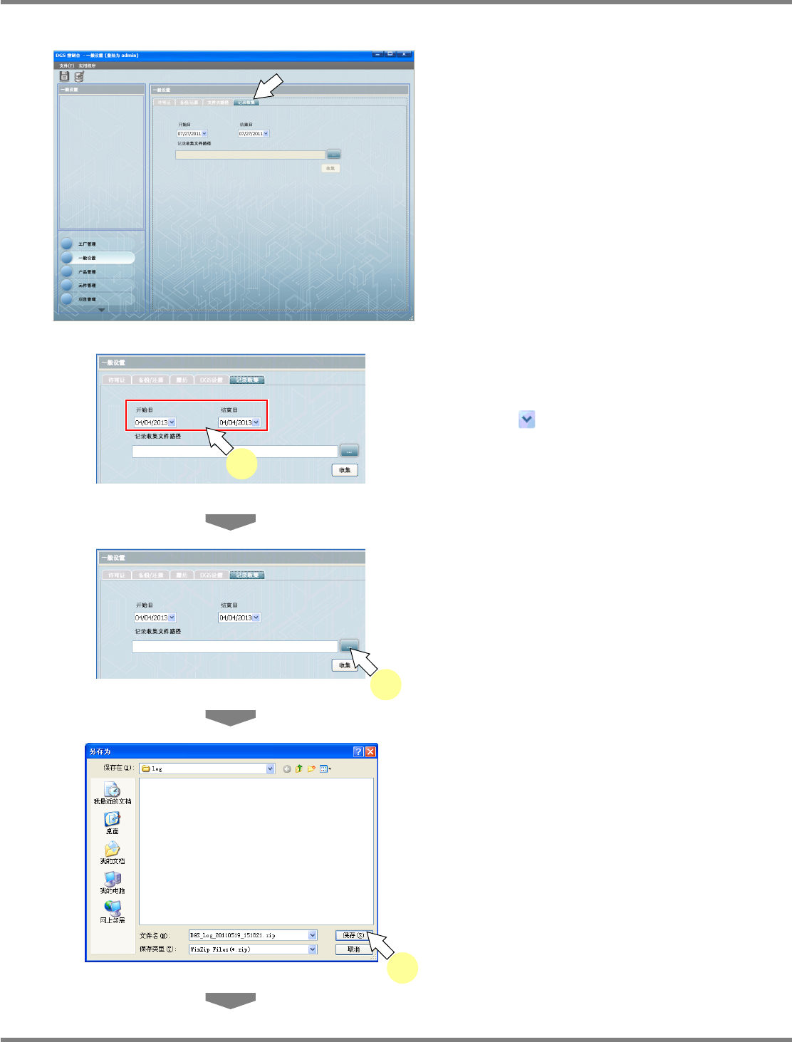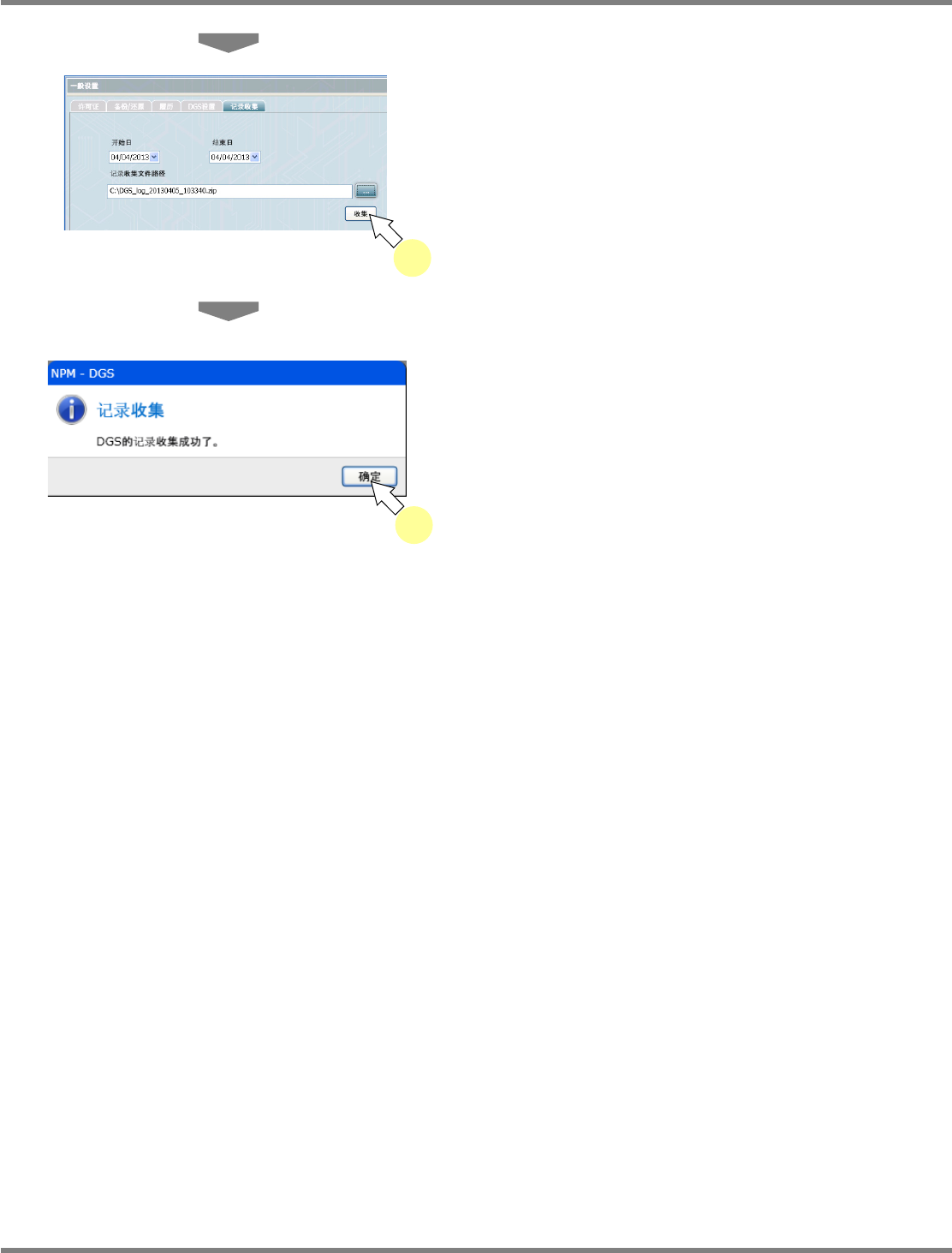 NPM-DGS 程序手册 3.2 关于环境设定画面 Page 3-36 EJS9AC-MB-03P-16 4 点击 [ 收集 ] 。 5 点击 [ 确定 ] 。 即会在指定的文件夹内保存纪录文件 。 收集纪录的步骤如上所示。 请将所搜集到的纪录写进 CD-ROM 等媒体后, 寄送给本公司的售后服务部门。 Environment03 0102S-06C00 5 Environment03 0204S-03C01 4