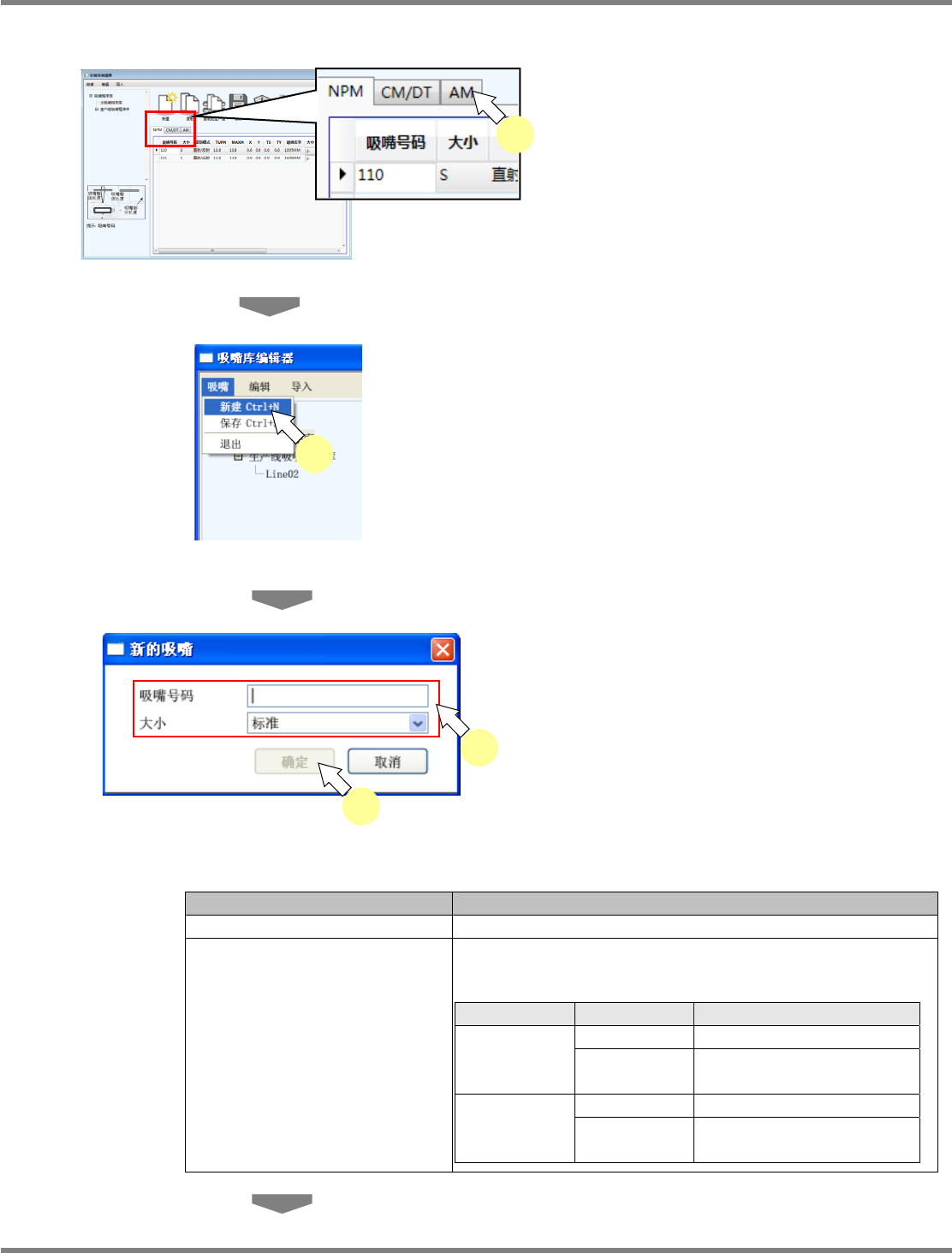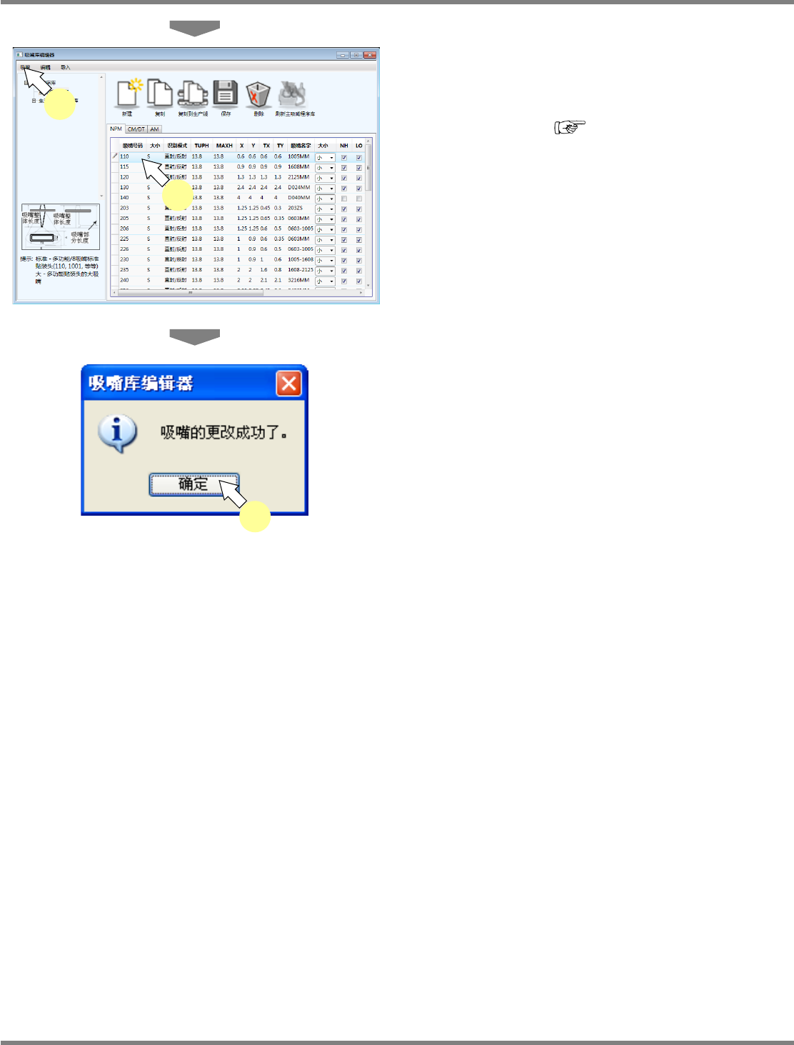 NPM-DGS 程序手册 4.4 吸嘴程序库编辑器 EJS9AC-MB-04P-35 Page 4-71 4.4.4 追加新建吸嘴 1 选择追加的吸嘴种类。 NPM,CM/DT 或 者 AM 2 选择菜单栏的 [ 吸嘴 ] [ 新建 ] 。 将显示 < 新的吸嘴 > 画面。 3 指定 ‘ 吸嘴号码 ’ 以及 ‘ 大小 ’ 。 4 点击 [ 确定 ] 。 吸嘴一览,从上段起按照号码的大小 顺序而显 示,因此所输入的…