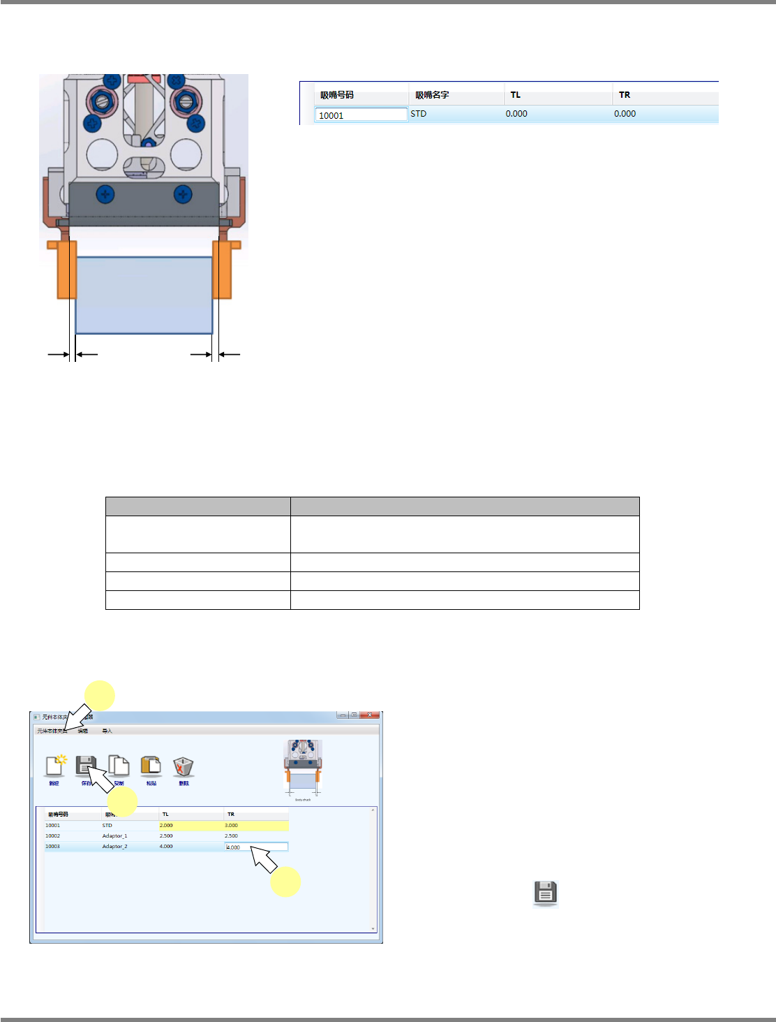 NPM-DGS 程序手册 4.8 元件本体夹具库编辑器 Page 4-98 EJS9AC-MB-04P-35 4.8.3 元件本体夹具数据 在这里对元件本体夹具数据的详细内 容进行说明。 元件本体夹具数据的设定项目 项目 说明 ‘ 吸嘴号码 ’ 表示元件本体夹具适配器的设置号码 。 ・ 在 10001 ~ 10999 的范围内进行设定。 ‘ 吸嘴名字 ’ 显示元件本体夹具的名称。 ‘TL’ 左侧适配器的厚度 ‘TR’ 右侧适配器的厚…