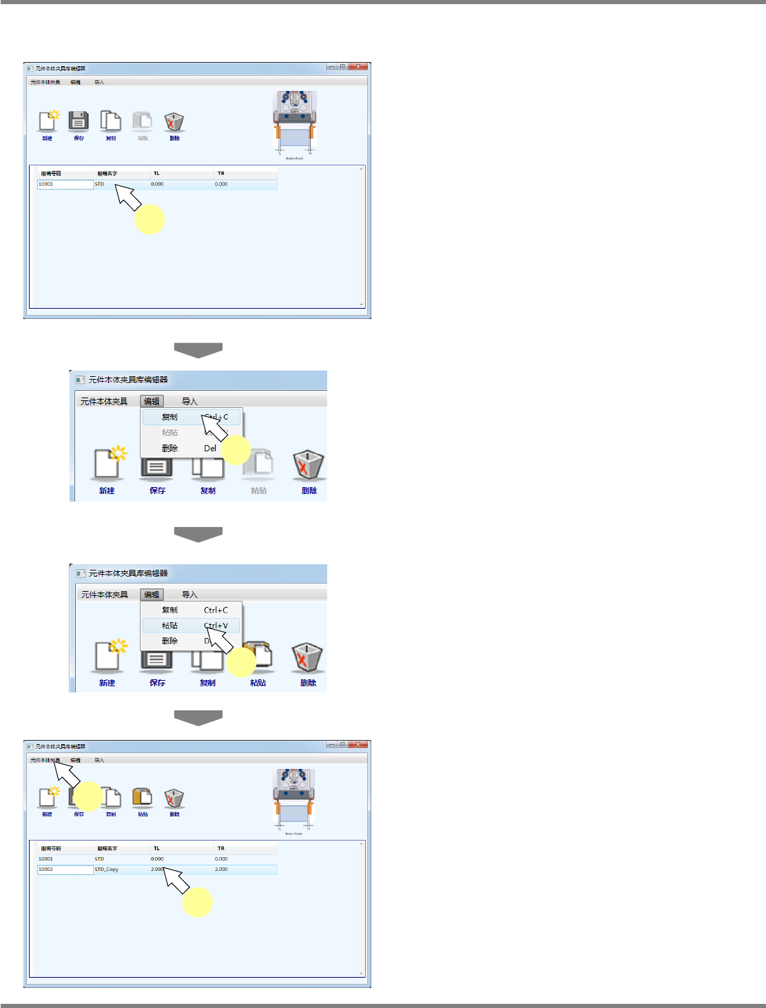 NPM-DGS 程序手册 4.8 元件本体夹具库编辑器 EJS9AC-MB-04P-35 Page 4-99 4.8.4 元件本体夹具的追加新建 1 选择菜单栏的 [ 元件本体夹具 ] →[ 新 建 ] 。 2 输入元件本体夹具的详细内容。 必须设定的详细内容,由本公司连同 元件本体 夹具一同提供。请将记述内容输入到 追加行的 数据中。 3 选择菜单栏的 [ 元件本体夹具 ] →[ 保 存 ] 。 Factory041000S-0 …
