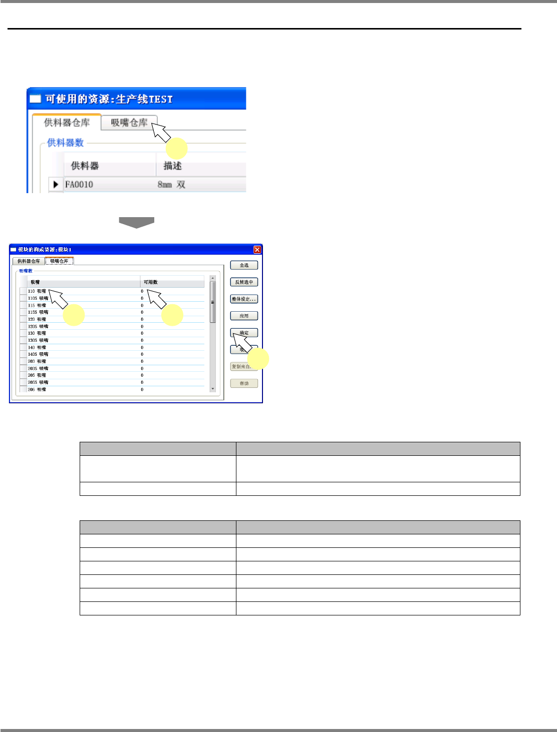 NPM-DGS 程序手册 4.12 吸嘴仓库 Page 4-122 EJS9AC-MB-04P-35 4.12 吸嘴仓库 吸嘴总数的设定 在供料器仓库画面上打开吸嘴仓库画 面,编辑各吸嘴类别的总数。 1 点击 [ 吸嘴仓库 ] 标签。 显示出吸嘴仓库画面。 2 从 ‘ 吸嘴 ’ 栏中选择吸嘴。 3 在 ‘ 可用数 ’ 栏里输入拥有的吸嘴数。 4 点击 [ 确定 ] 。 设定项目 项目 说明 ‘ 吸嘴 ’ 用吸嘴程序库编辑器设…