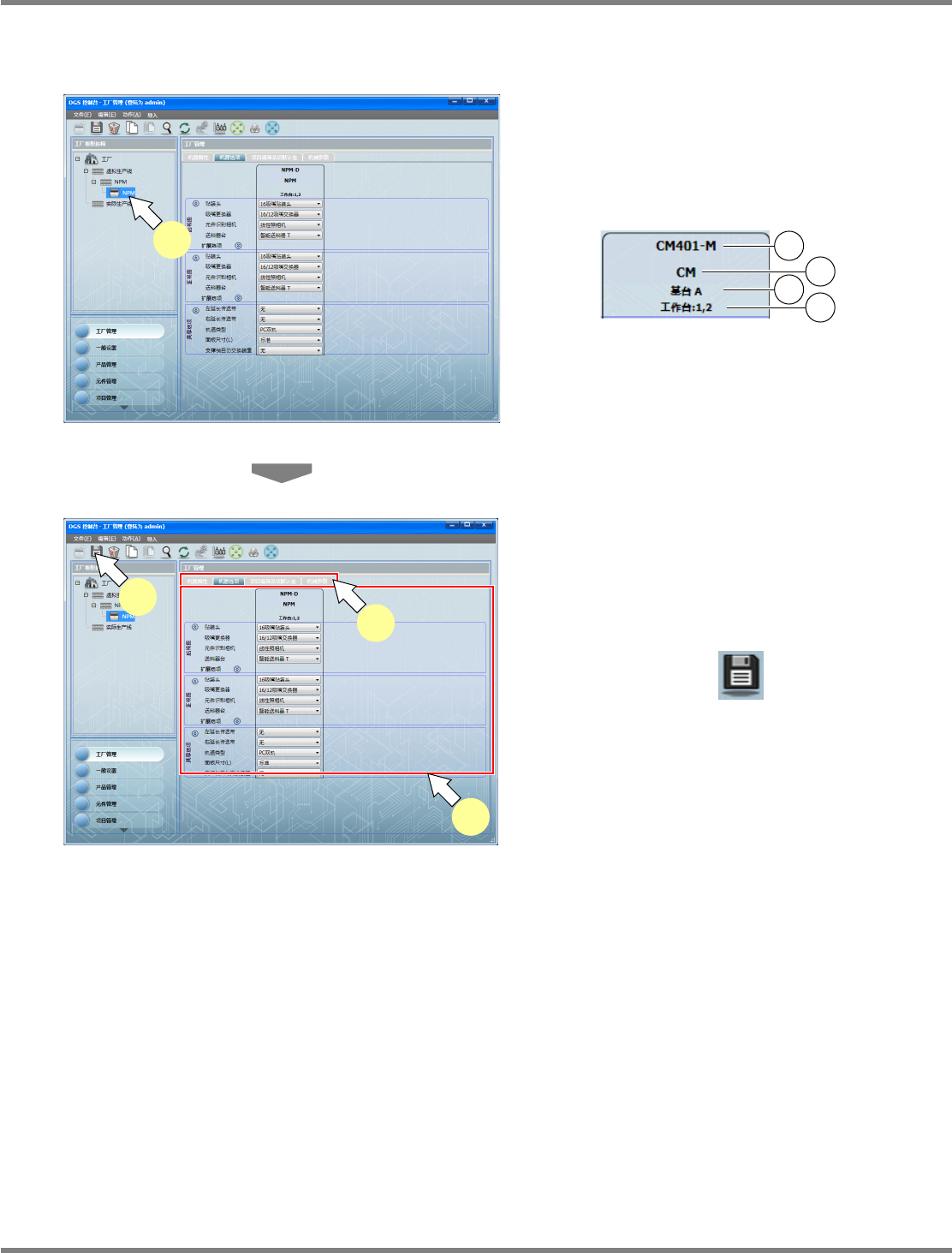 NPM-DGS 程序手册 4.3 假想生产线的构筑 EJS9AC-MB-04P-35 Page 4-29 设备选项、参数设定的确认、编辑 设定与设备相关的参数。 1 选择画面左上树形菜单上的设备。 在工厂内容区域里显示出各自的设定 项目。 显示在工厂内容区域中的设备,按照 从左起的 顺序显示,并在页眉上如下显示 : a) 表示设备机种 b) 表示设备名称 c) 表示基台名称 ( 仅限 CM/DT 设备 ) d) 从生产线打头…
