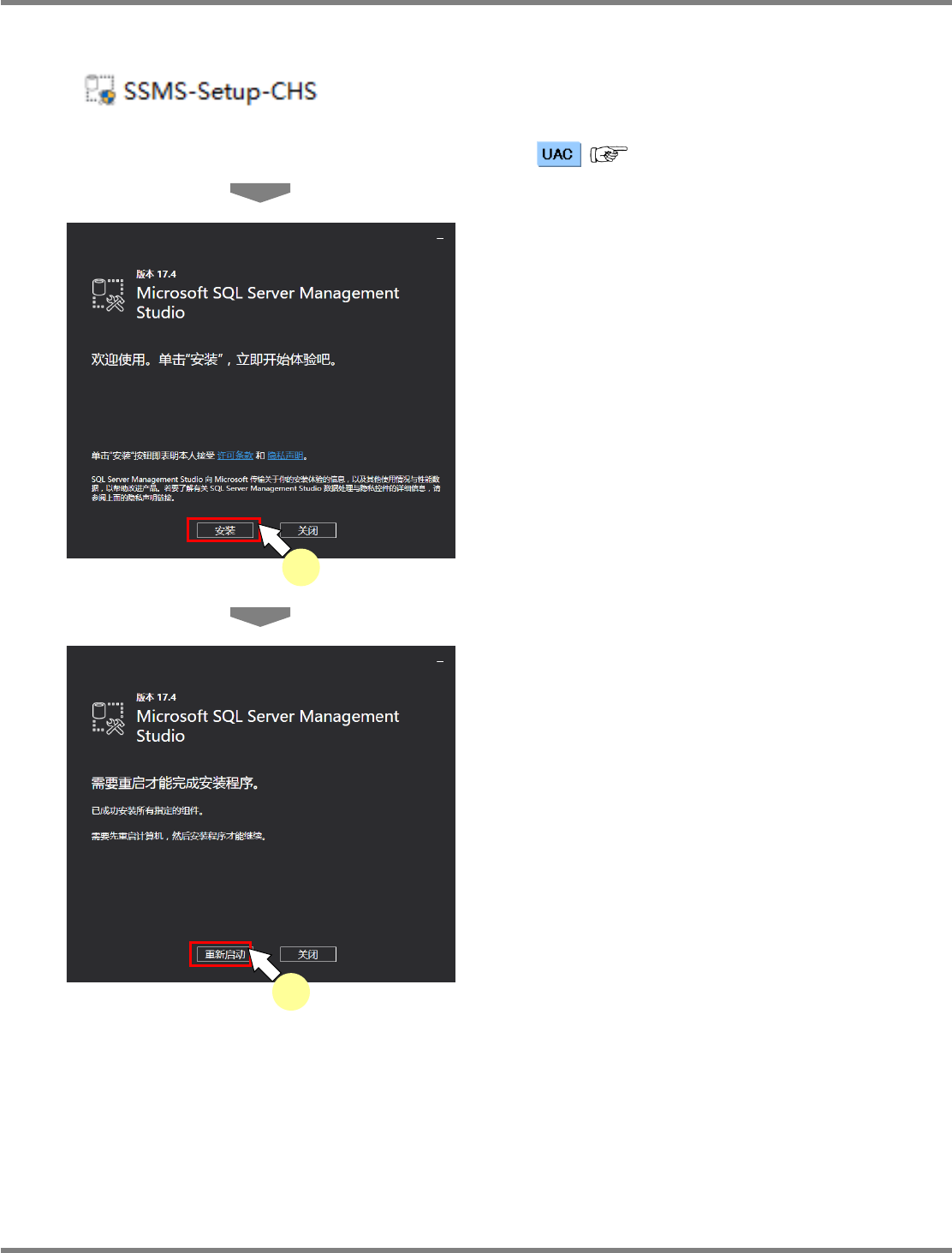 NPM-DGS 程序手册 2.1 NPM-DGS 的安装 Page 2-18 EJS9AC-MB-02P-19 Microsoft SQL Server Management Studio 的安装 1 启动 ‘Microsoft SQL Server Management Studio ‘ 的安装程序。 ( ‘1.3.1 关于用户帐户控制 ’) 2 点击 [ 安装 ] 。 3 点击 [ 重新启动 ] 。 接着请按照 “2.1.8…