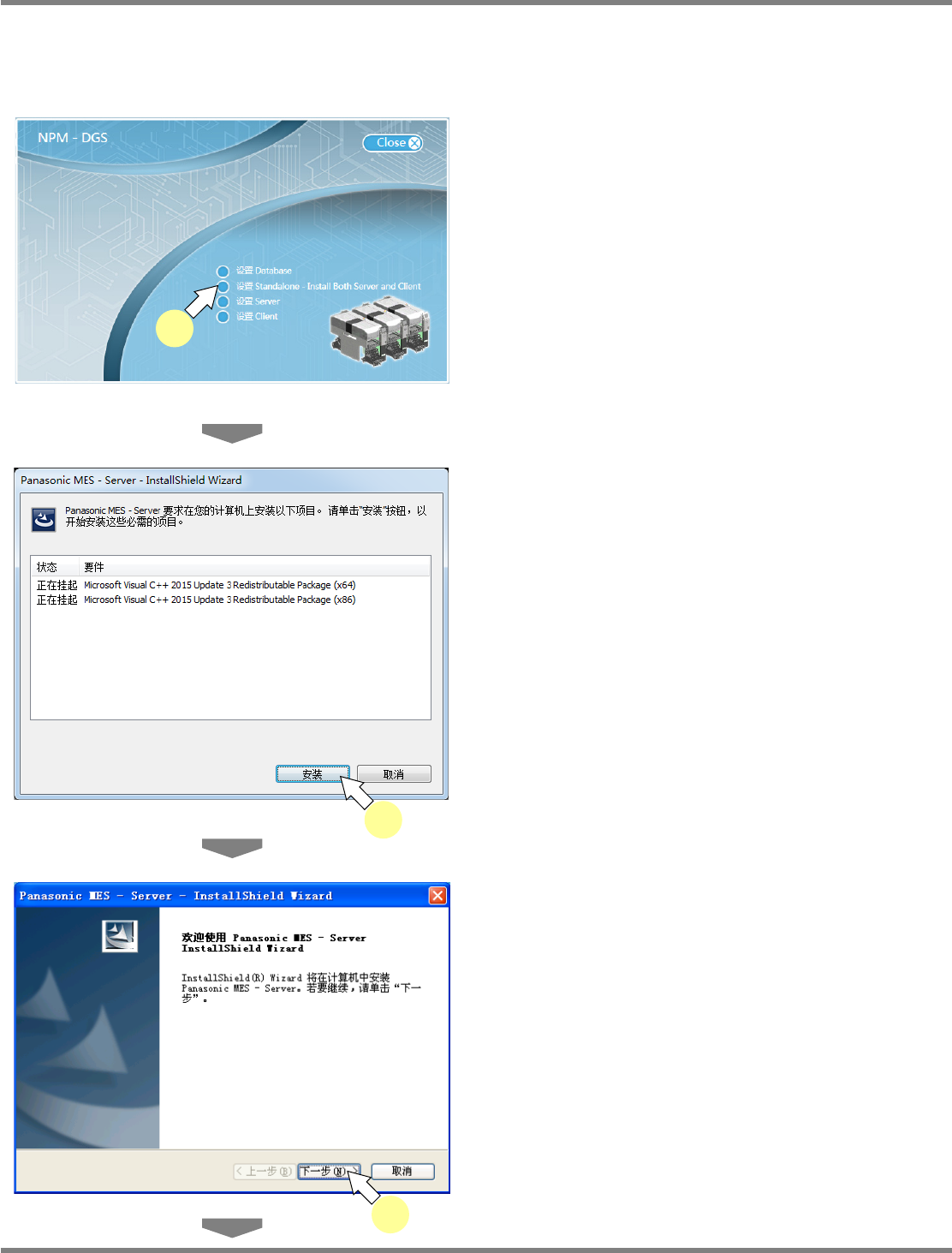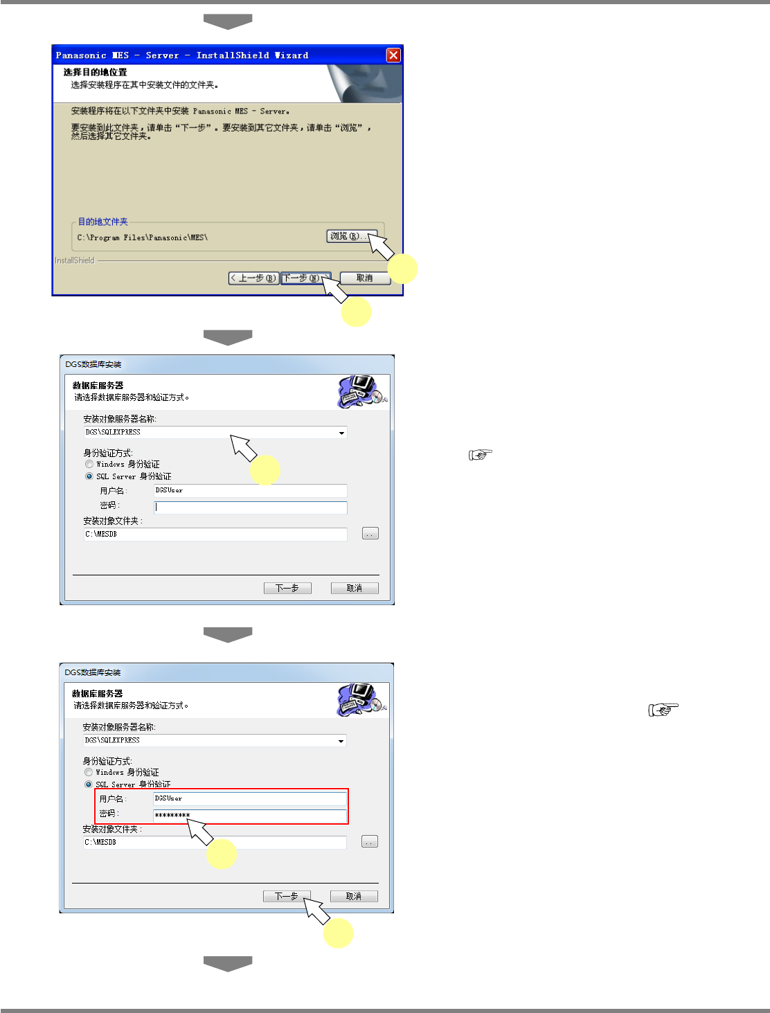 NPM-DGS 程序手册 2.1 NPM-DGS 的安装 EJS9AC-MB-02P-19 Page 2-57 4 需要变更安装目的地时,点击 [ 浏览 …] 选择文件夹。 通常无需变更。 5 点击 [ 下一步 ] 。 6 在 ‘ 您要安装到的数据库服务器 ’ 栏里输 入服务器名。 通常输入 ‘ 电脑名 \SQLEXPRESS’ 。 服务器名的确认方法 : ‘2.1.10 NPM-DGS 的安装 ’ ‘ 服务器名 的确认…
