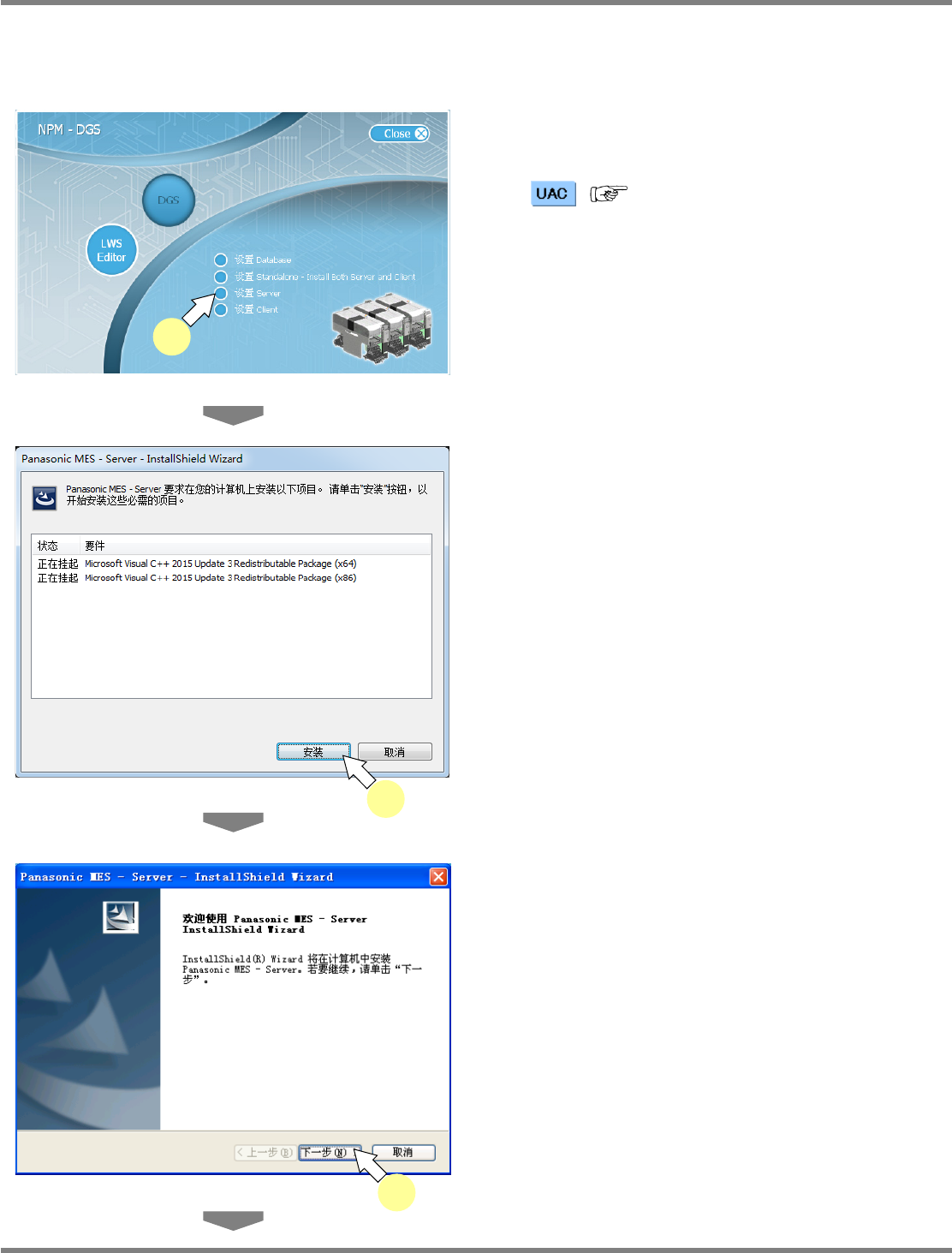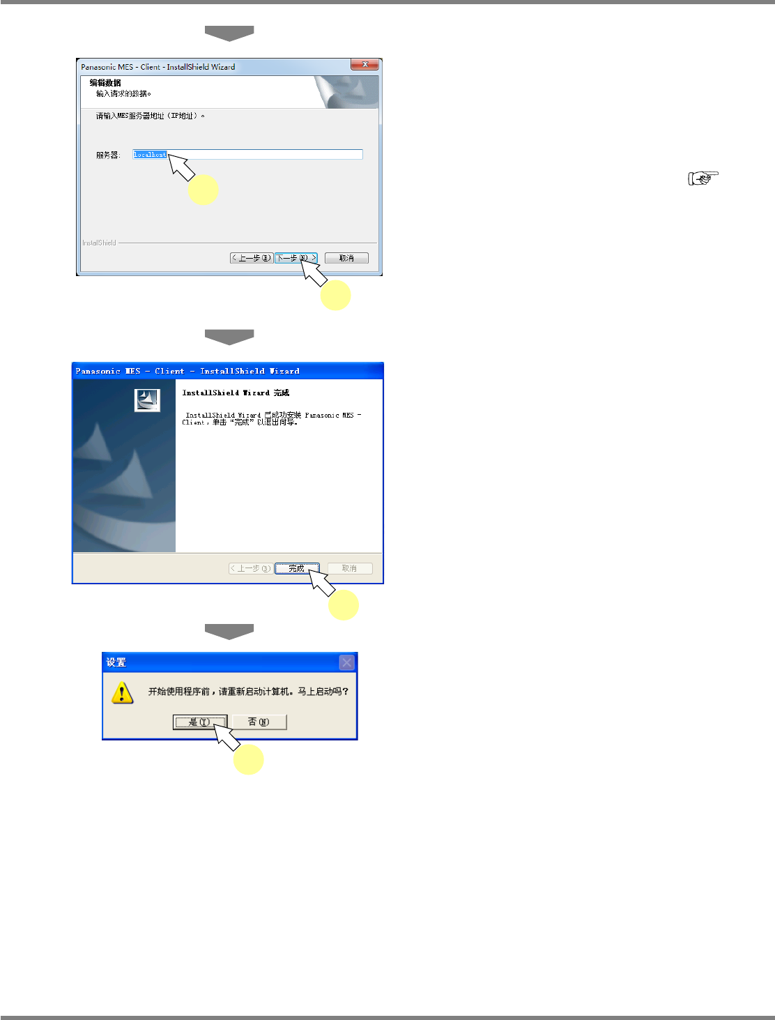 NPM-DGS 程序手册 2.1 NPM-DGS 的安装 EJS9AC-MB-02P-19 Page 2-59 11 在 ‘ 服务器 ’ 中输入 ‘localhost’ 。 12 点击 [ 下一步 ] 。 在安装后也可通过更改工具变更连接 处服务 器。关于服务器更改工具,请参照 ‘13.7 服务器更改工具 ’ 。 13 点击 [ 完成 ] 。 14 在重新启动确认画面上点击 [ 是 ] 。 Install020201S-3 6C01…