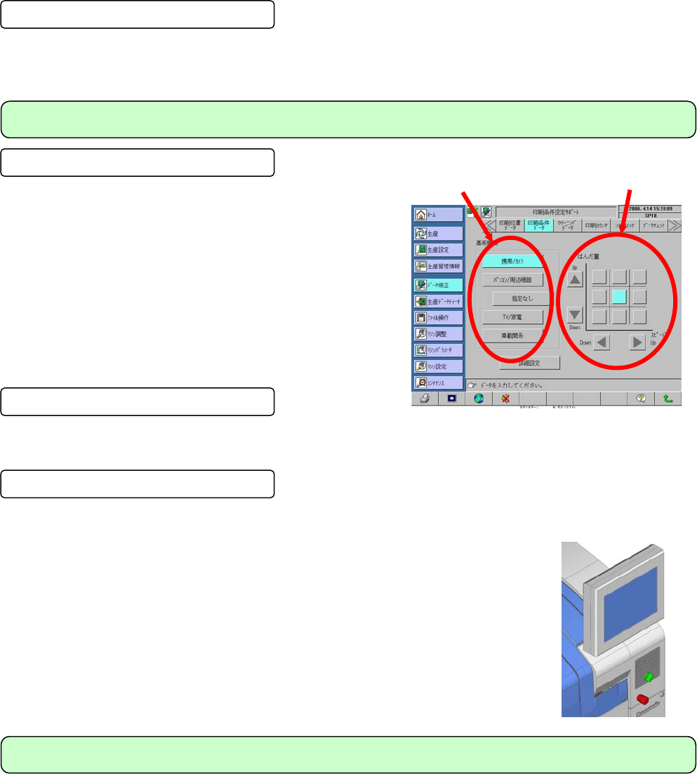 SP18P-L 2006.0601 - 2 - 重复定位的精度 重复定位的精度 : ±12.5 μ m 简单操作 印刷条件调整辅助功能 作为操作员的简单操作功能, 开发了印刷条件调整辅助 功 能。 根据 Panasonic 的丰富印刷实验数据库, SP18P-L 只需 选择生产品种即可设定标准印刷条件 。 只要按微调整或调 整按钮即可简单进行。 另外, 至今为止的操作画面都有保 存,根据使用环境能够自由使用。 准备交换模式 搭载了准备交…