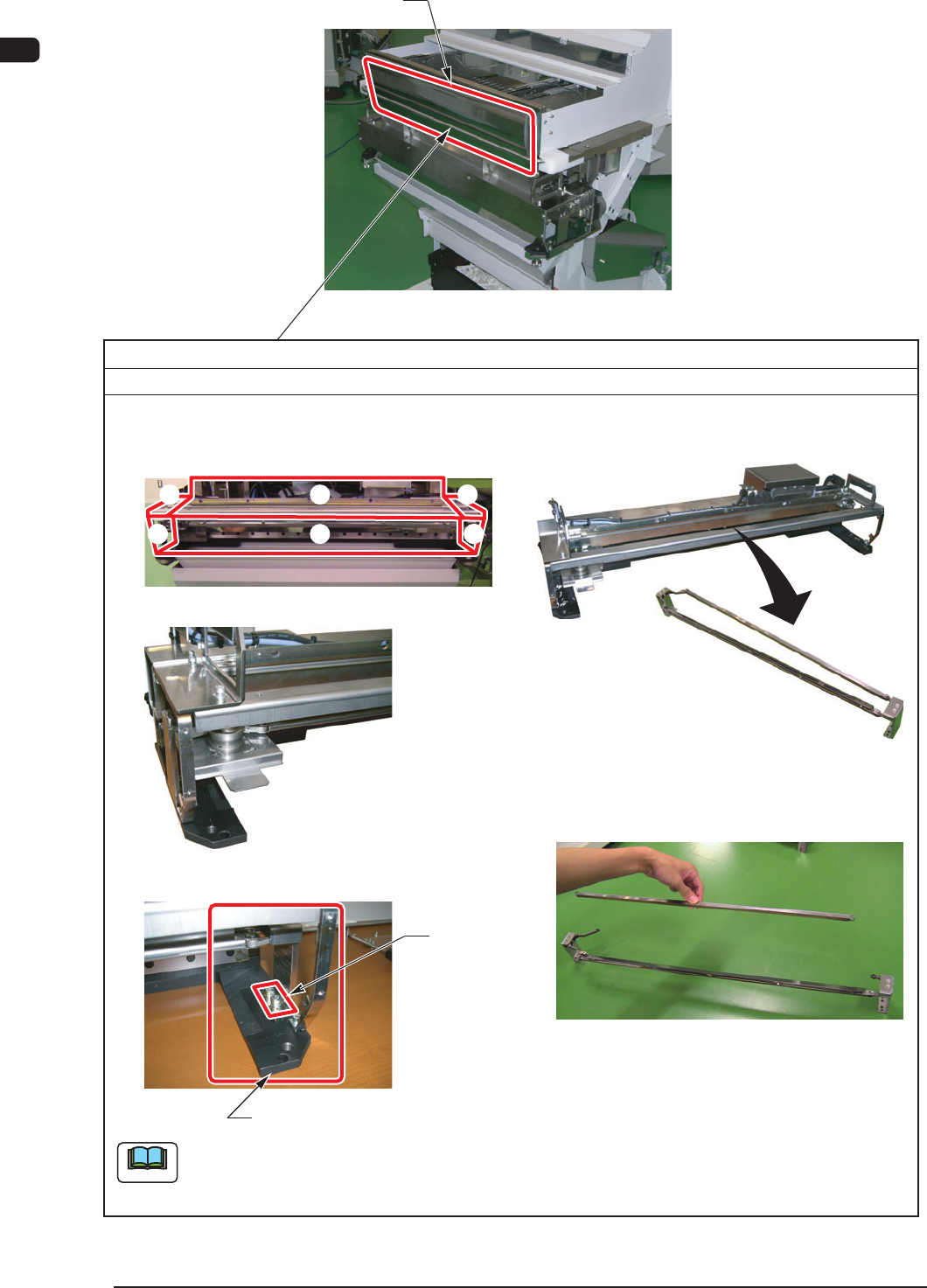 4OM-1610 1-29 3. Maintenance Spots : Chap.1 091 1-001 Removed fluorine-processed sheet. Front Safety Bar (2) Remove the tape guide. (1) Remove the front safety bar and take out the cutter from the cart. (3) Remove five s…