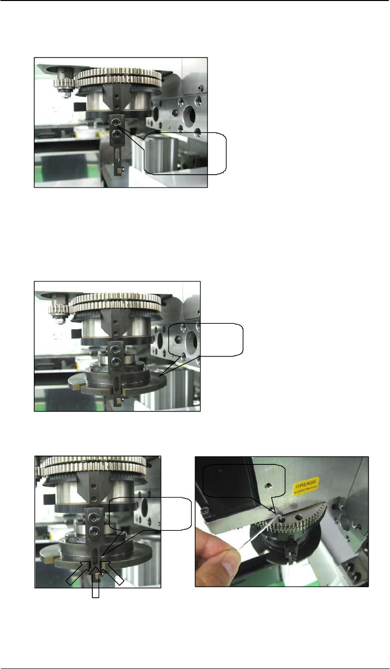 12. 松开下图中 hook 上的 2 颗螺栓 , 将 hook 下部下降到最低位置 . Loosen the 2 bolts Lower the hook 13. 选择 Z-axis 微动模式 , 很慢很 小心的将 Z-axis 下降到第 11 步记录的 Z_ RevolverNozzleDownHeight 数值 . 14. 如图所示 , 很松的将 hook 锁紧 jig 安装到 hook 上 . Loosely attach th…