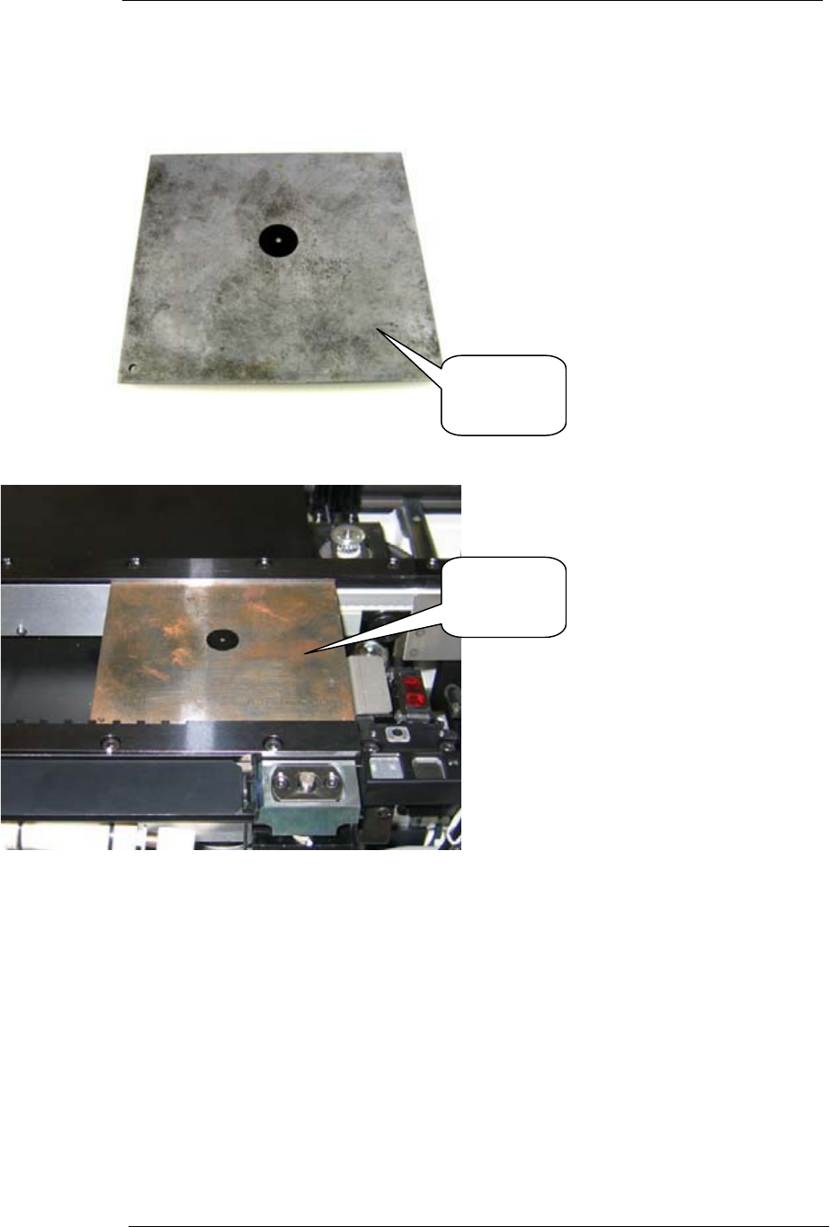 第 6 章: 固有值测定 6.1 测定 PCB 原点 要求治具: 1. 把维修模式钥匙转到“ ON ” ,然后选择 [Maintenance] – [Jog] ,进入维修保养模式移动界面。 2. 把铁板治具放在轨道上,升起挡块。 3. 移动铁板治具,靠着挡块位置,然后夹板。 4. 从相机下拉菜单找到 Mark 相 机,选择 [Fiducial] 。 5. 移动 Mar k 相机到铁板治具右 手边的原点孔中心。 铁板治具 : AJPJ 0…