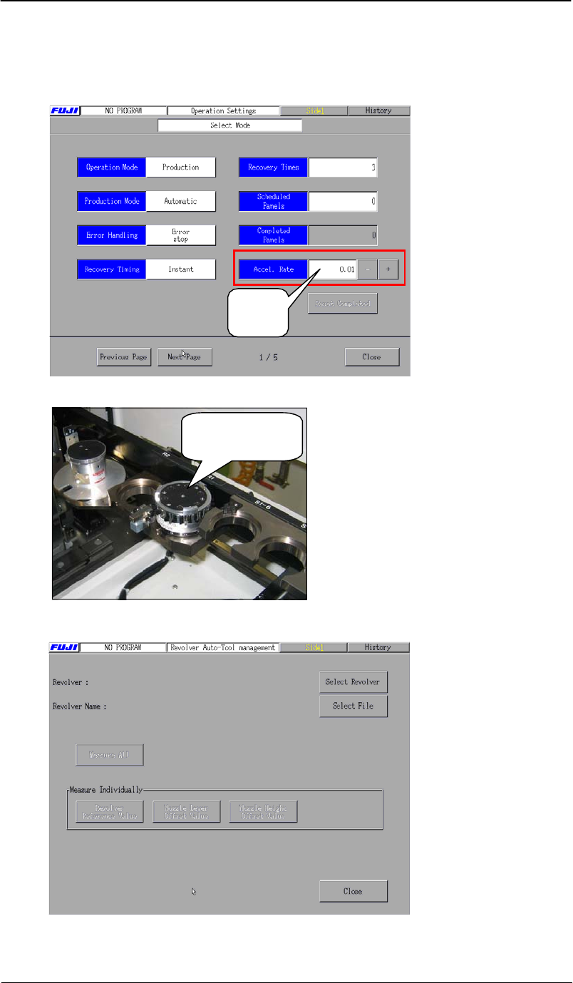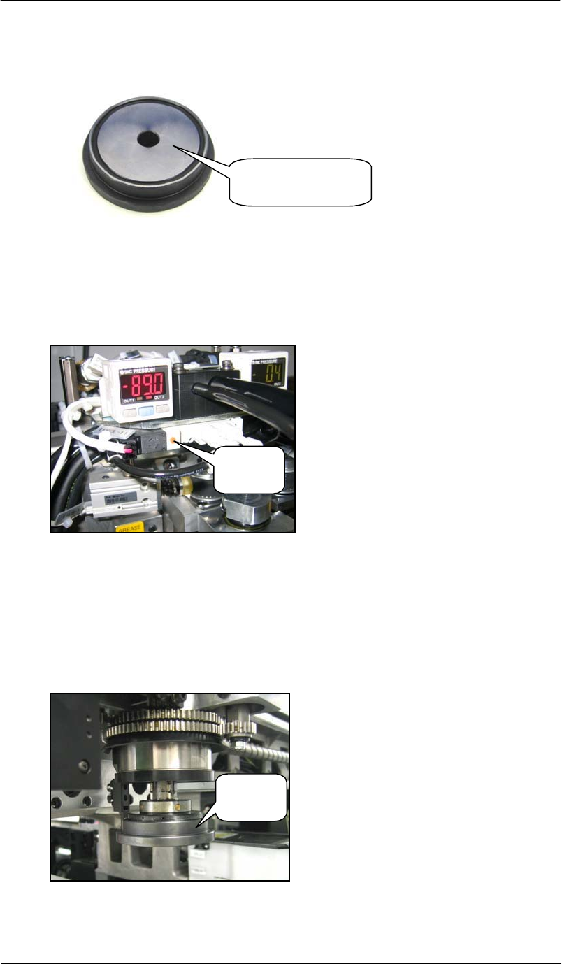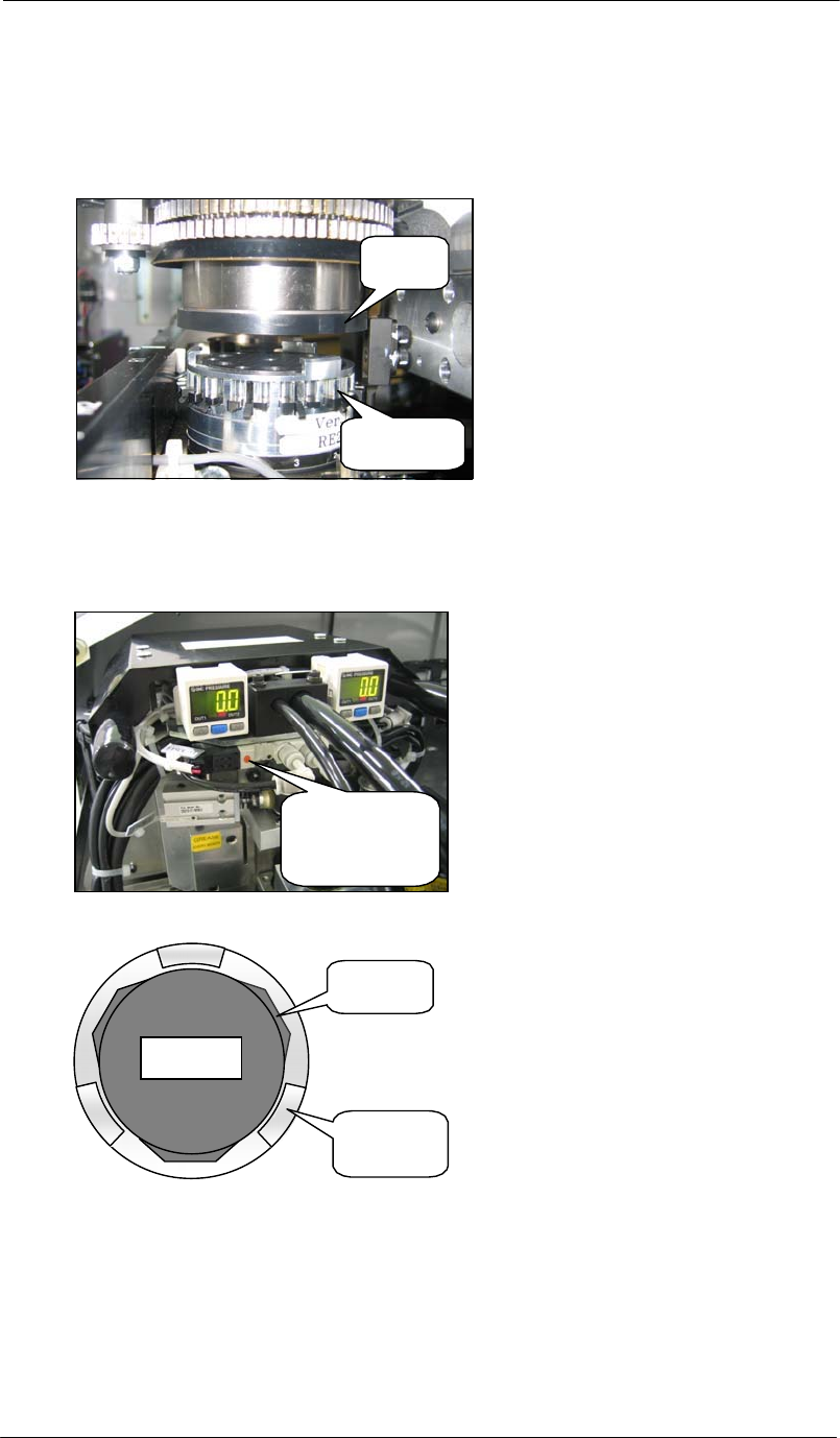 4. 按下 【选择旋转头】 – 【旋转头 1 】,机器准备吸取旋转头,先不要急着按 开始键 ; 5. 为了检查干涉,需要 工作头直接停在旋转头的正上 方。按下 开始键,等工作头移 动到旋转头正上方,刚开始下降的时候,按下紧急停止开关,正确的位置如下图(从 side 2 看); 工作头 旋转头 6. 选择 【维修保养】 – 【 I/O 检查】 – 【 RY01B VacuumPumpOn 】 – 【 OFF 】 and 【 Y010 Va…