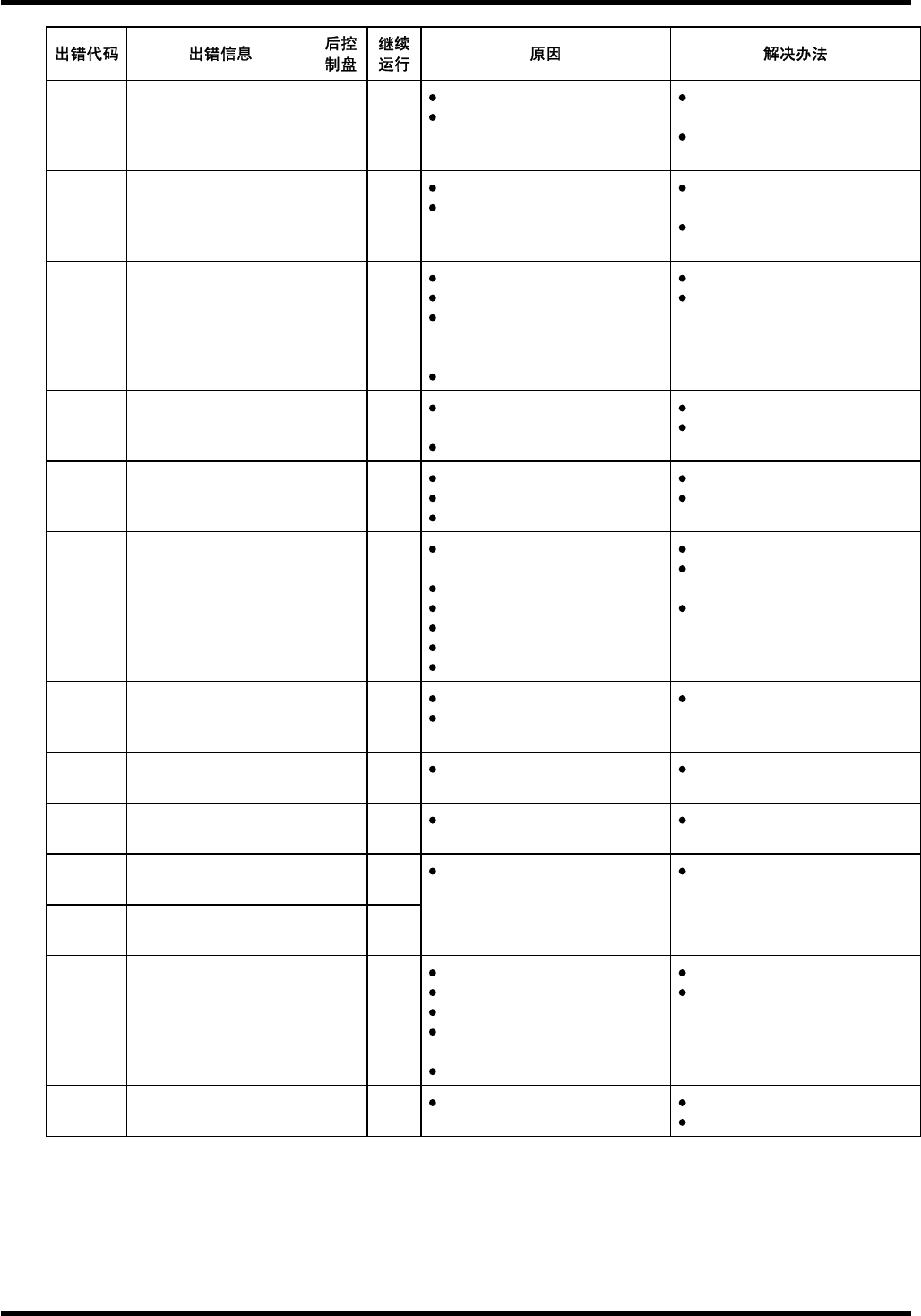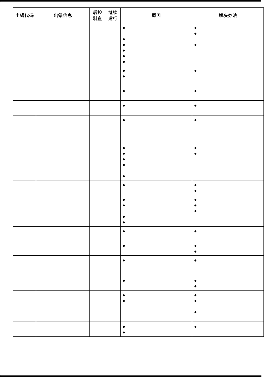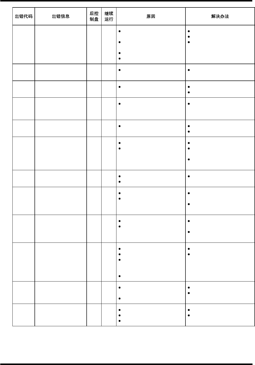 AVK3 操作手册 7.6 错误代码:与 NC 有关的错误( NC ) NC0300 ZL 轴正限位 ( 120 站设备) ON OK 尝试将 ZL 轴超出正极限位置。 ZL 轴正限 位极限传感器出错 ( M )。 检查是否在正限位范围之内进行 示教和定位。 检查正极限传感器的和传感器挡 铁的状况。 NC0301 ZL 轴负限位 ( 120 站设备) ON OK 尝试将 ZL 轴超出负极限位置。 ZL 轴负限 位传感器出错( M )。 …